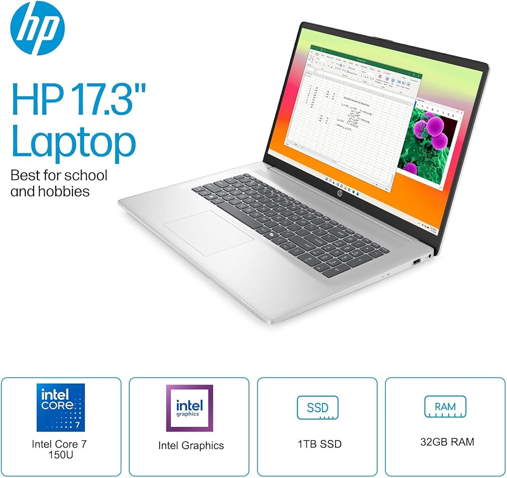 ELEVATE YOUR PRODUCTIVITY - The HP 17.3-inch Laptop PC combines an ergonomic lift-hinge design for improved airflow and typing comfort with a high-resolution, narrow-bezel display for immersive visuals. Powered by an energy-efficient Intel processor, it delivers robust performance while maintaining eco-conscious operation—all in a sleek, professional package designed for all-day comfort and productivity