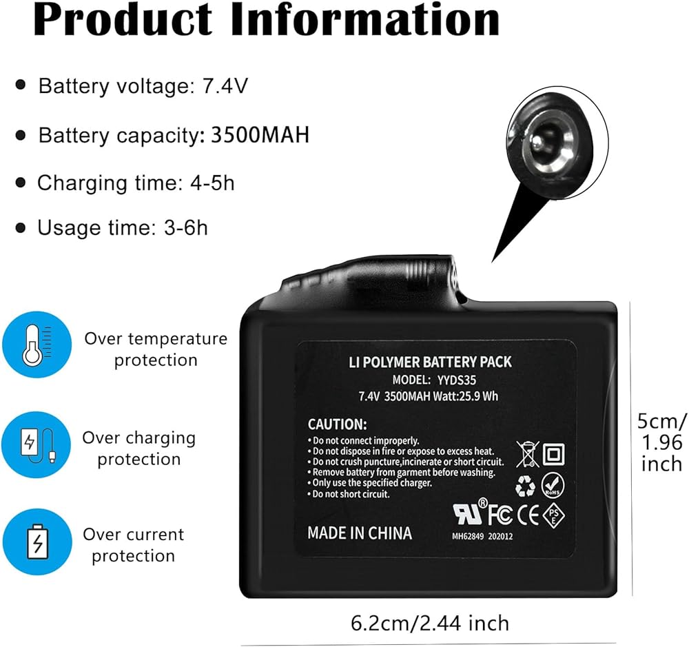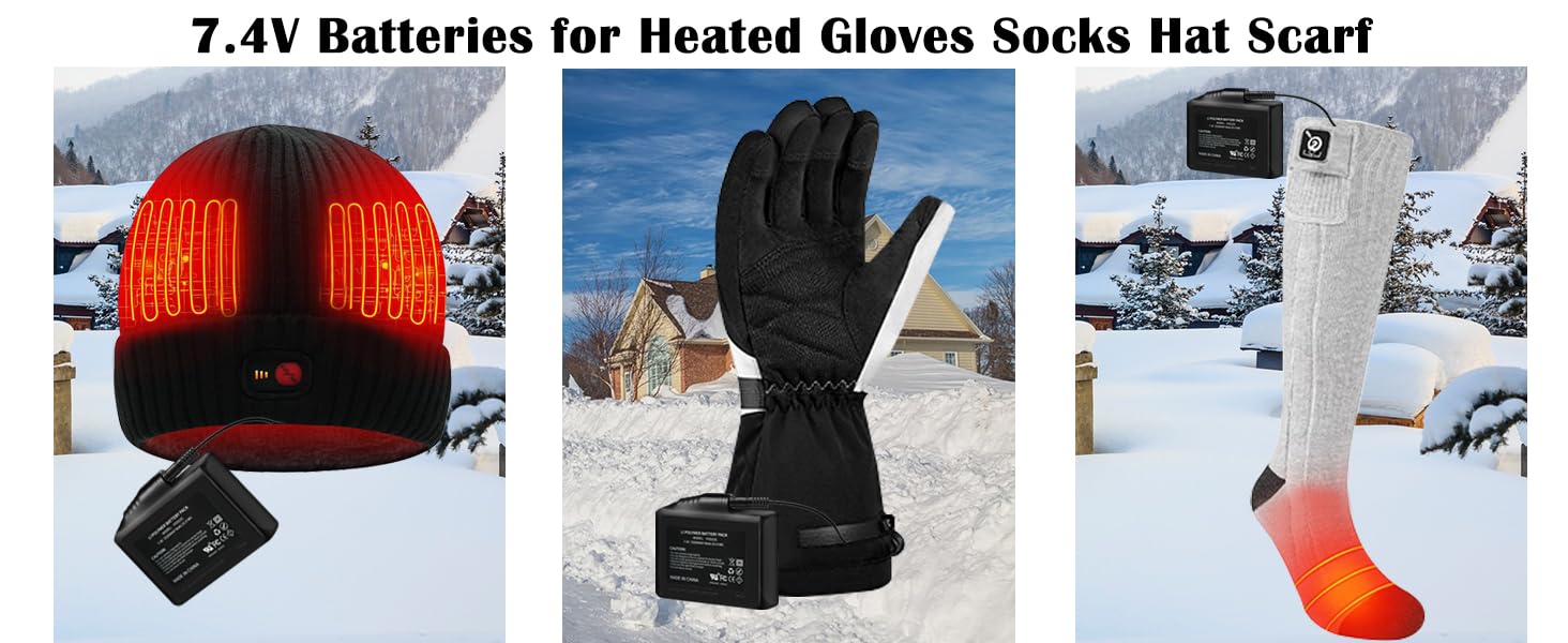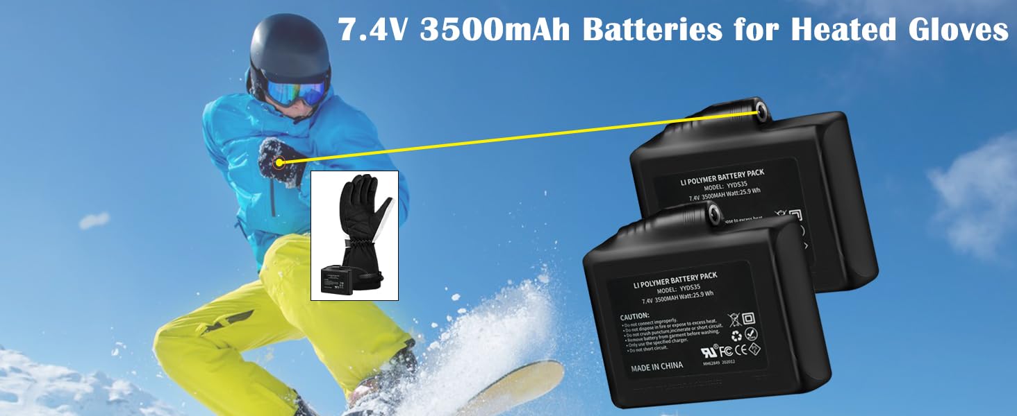 3500mAh Lithium Polymer Batteries:2pcs 7.4V 3500mAh rechargeable lithium polymer batteries compatible with 7.4V Waestcia, JS LifeStyle, WEIVIOQ, snow deer, deorfgo, savior HEAT heated gloves, justfx, savior HEAT, SNOW DEER heated socks, 7.4V Eomsezer, Autocastle heated hat and ORORO heated scarf cloths for winter outdoor sports such as cycling, skiing, climbing, hunting and fishing. Long press the heated glove button to start charging after inserting the battery into it