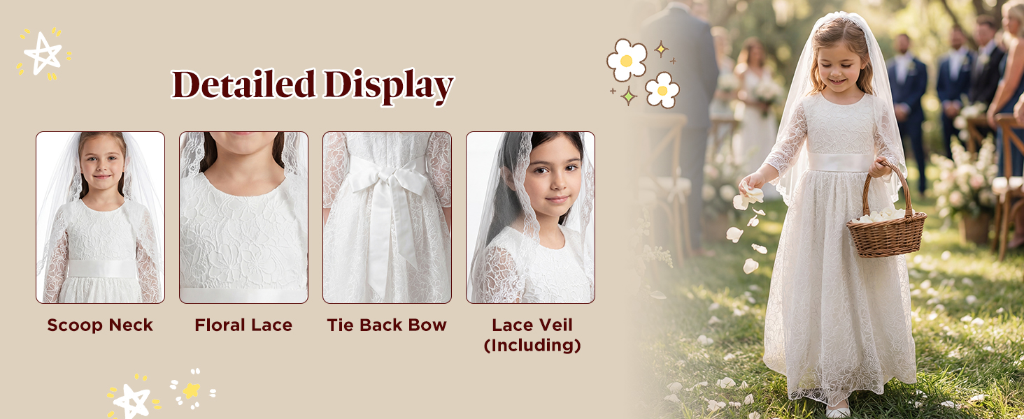 2-Piece Set with Matching Veil: Unlike standard dresses, this first communion dress comes with a beautiful, coordinating lace-trimmed veil. It completes the angelic look instantly, saving you the hassle of finding a matching accessory separately.