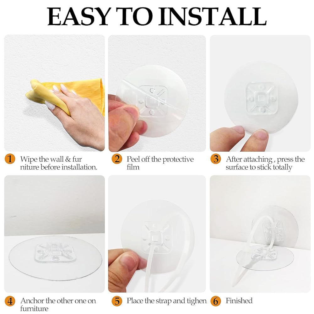 🔧【No Drill Wall Anchor for Furniture】: This furniture anchors does not require any drilling, hence making it a better choice for home safety.Easy to install and remove,please wipe the surface both of the wall and furniture before use, peel off the protective film, firmly stick it on the flat and non-porous surface to ensure stick tight, then tighten with the anti tip nylon straps. These wall anchors will not leave sticky adhesive after remove it.