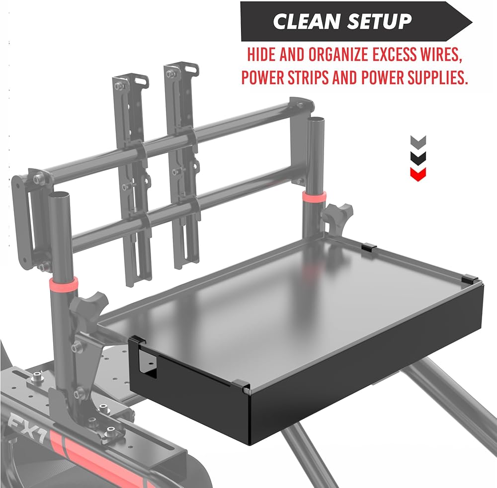 • ORGANIZATION: Provides dedicated space for managing excess cables, power strips, and power sources, keeping your simulator setup tidy