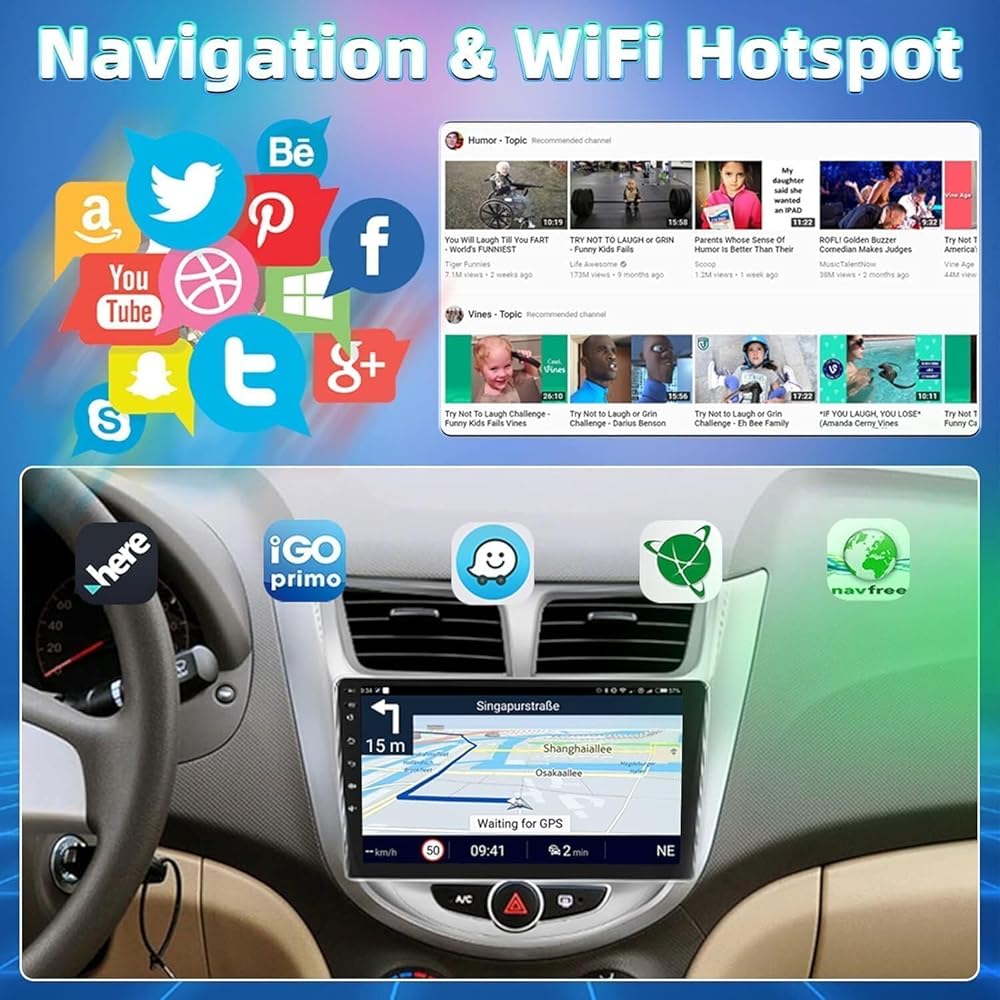 🚗【GPS Navigation & WiFi Connection】~The Accent stereo built-in GPS Navigation & WiFi Connection. You can watch real-time football games, use online map navigation, download and delete apps from the play store. This 9inch car radio supports online and offline navigation. You can navigate to anywhere even without the network, only need to download needed offline map data. You can go anywhere you want and never get lost again.