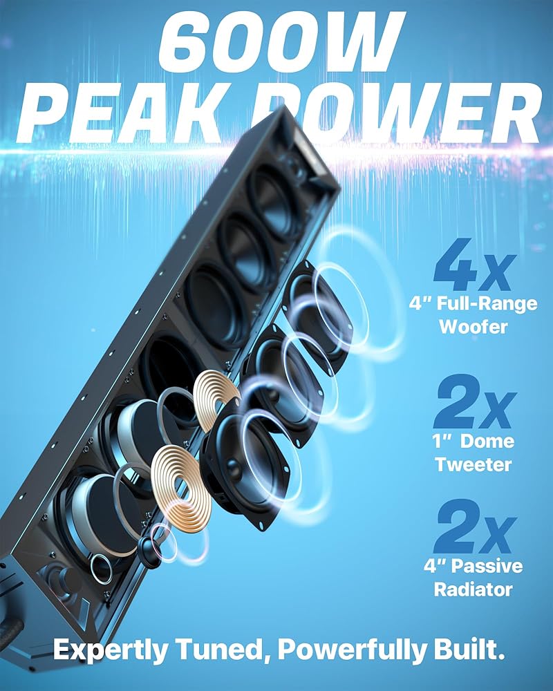 UTV Soundbar System: Experience powerful, crystal-clear sound built for the outdoors. The built-in amplifier outputs up to 600W, Equipped with 2 × 1" tweeters, 4 x 4" full-range speakers and 2 × 4" low-frequency radiators, high-volume sound with deep bass and clear highs—the sound quality with deep, punchy bass and crisp highs that remain clear even at highway speeds or during aggressive riding. Detachable Wired Control + Extension Cable - Relocate the controller to your dashboard for front-seat access, even if the soundbar is rear-mounted.