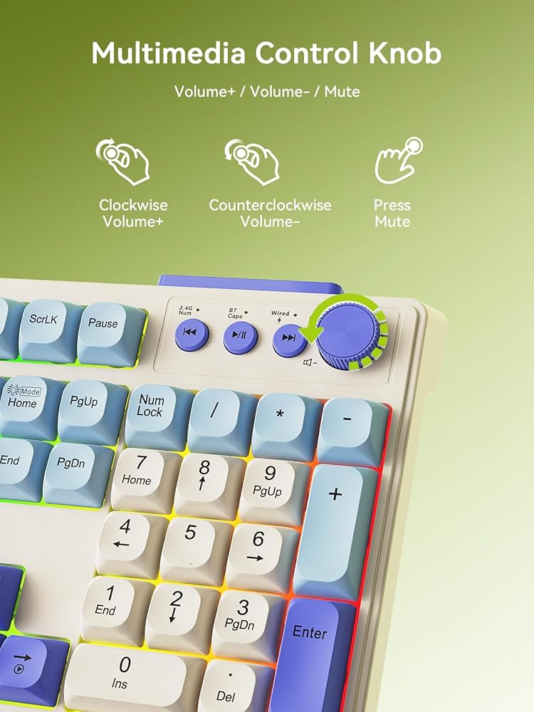 Unique Circles Keypad and Buttons: 80% Compact keyboard specially designed as circle keys provides superior typing experience. Low-noise switch button has excellent touch and sufficient button travel, provides satisfactory feedback with each stroke. Standard numeric keypad and media hotkeys improve your workflow and efficiency. Unique volume button is eye-catching which convenient to adjust the volume via rotating it freely.