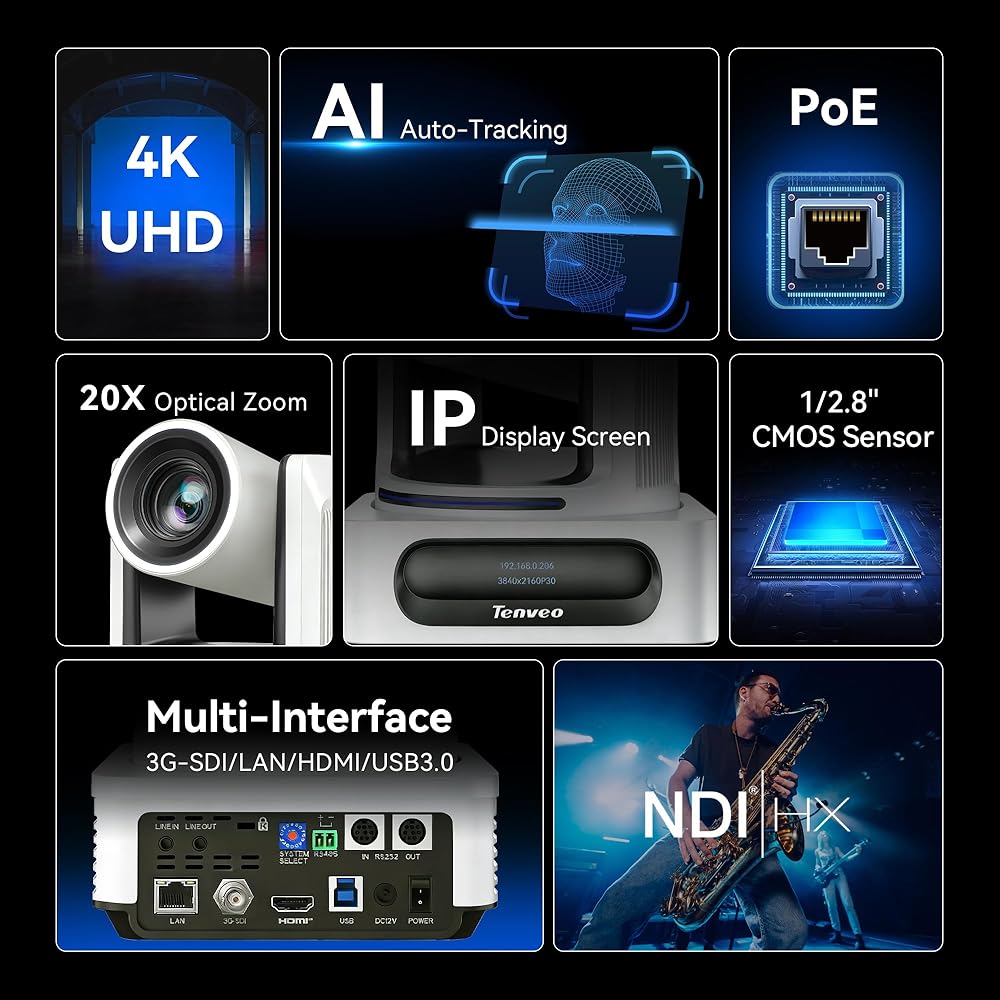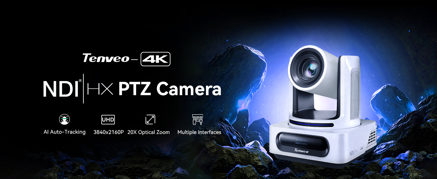 🌟Tenveo 𝐕𝐗𝟐𝟎𝐌-𝟒𝐊𝐍𝐖 - Powered by an 8.29MP 1/2.8" CMOS sensor, the 4K NDI 20X AI Auto Tracking PTZ Camera has HDMI(4K), 3G-SDI(1080P), USB3.0(4K), IP/NDI Streaming(1080P) output. PoE supports and 3.5mm audio Line in & Line out, surprices you with a real color and crystal video quality. Features Tally Light and Status Indicator screen clearly displays IP address, resolution, and frame rate. Use Tenveo IP Search Tool to automatically scan and lists all Tenveo devices on your network.