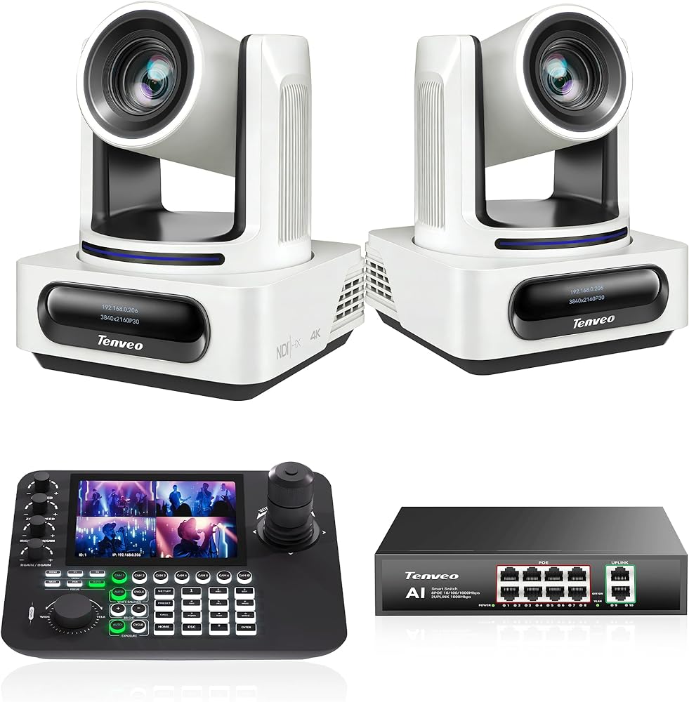 🌟Tenveo PTZ Camera Bundle INCLUDES: Tenveo 4K NDI AI Auto Tracking PTZ Camera SDI/HDMI/USB3.0/LAN(PoE) 20X Zoom Streaming Camera(𝐕𝐗𝟐𝟎𝐌-𝟒𝐊𝐍𝐖 -2pcs), PTZ Camera Joystick Controller - 7'' LCD Quad-Screen Real-time Preview 4D Joystick NDI PTZ Controller(𝐊𝐁𝟑𝟎𝟎𝐏𝐑𝐎) and 8 Port Full Gigabit PoE Switch, which is ideal for Church Live Service, Video Conference, School, Hospital, Wedding, Live Streaming, Broadcast, Online Education, Product Launch, Video Production and House of Worship.