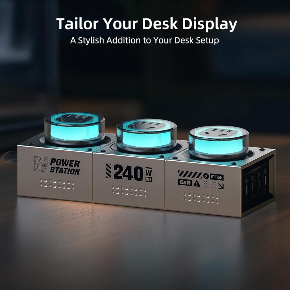 Upgrade your workspace with the Mfish 240W GaN Charging Station for Multiple Devices, the ultimate power hub designed for gamers, tech enthusiasts, and professionals who demand speed, safety, and style. Engineered with advanced GaN technology, this multi-charging station delivers high efficiency, lower heat generation, and stable performance even under heavy load. Equipped with 4 USB-C ports and 3 AC outlets, it effortlessly powers laptops, tablets, smartphones, gaming consoles, and home electronics at the same time. With a total output of 240W for USB ports and 2500W for AC outlets, this fast charging station ensures that every device—from MacBook Pro to gaming monitors—gets the power it needs. The ports are intelligently distributed into strong and weak current zones, keeping your devices safe while optimizing charging speed for each category. Perfect for both home and office setups, this desktop charging station keeps your desk clean, organized, and clutter-free. The multi-port USB charging station design eliminates messy cables and multiple adapters, offering a single sleek hub for all your electronics. Whether you're running a high-performance gaming rig or managing multiple productivity devices, the multi-device charging station supports simultaneous fast charging without compromise. The RGB ambient lighting adds a futuristic gaming atmosphere, making it ideal for eSports players, streamers, and tech lovers who appreciate aesthetics as much as performance. With soft, customizable colors, the lighting enhances your gaming station or workstation with a cool, modern vibe that matches your gear. Built with premium fireproof materials, this charging station guarantees long-term durability and safety. From late-night gaming marathons to intense creative sessions, Mfish keeps every device fully powered, efficiently cooled, and ready to perform. Mfish Desk charging station combines power, beauty, and advanced GaN innovation. The Mfish 240W is your go-to choice.