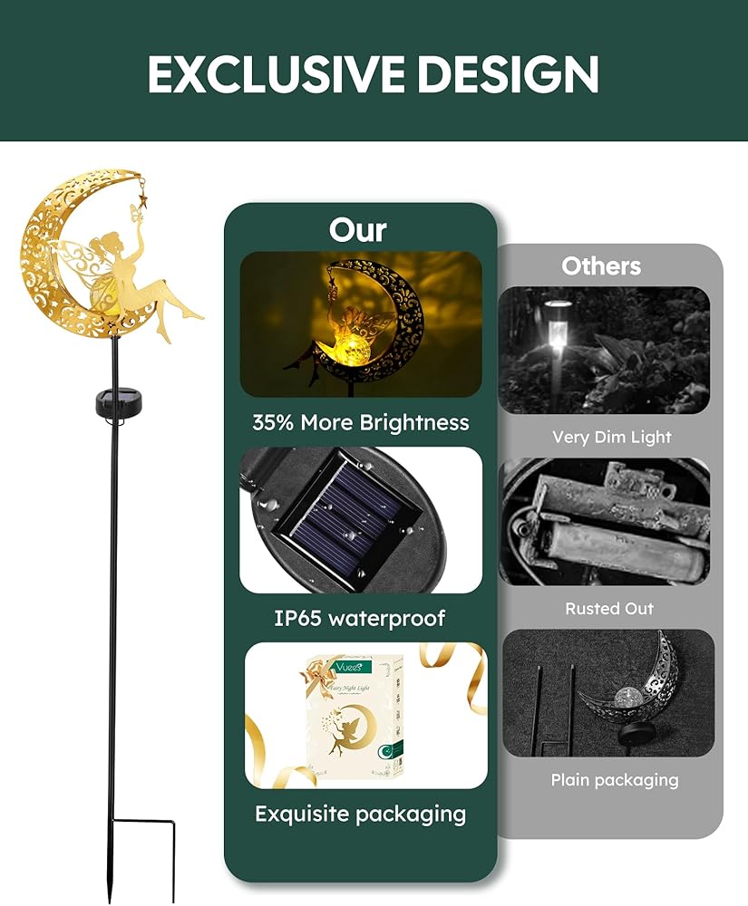 WEATHER-RESISTANT: Our Vuees solar garden decor lights are constructed with premium stainless steel and thick brass, ensuring durability. They are coated with rustproof paint and feature a waterproof IP65 design, allowing them to withstand various weather conditions and maintain long-lasting functionality.