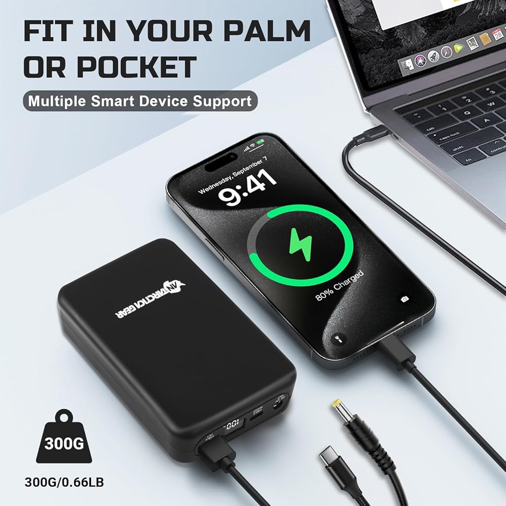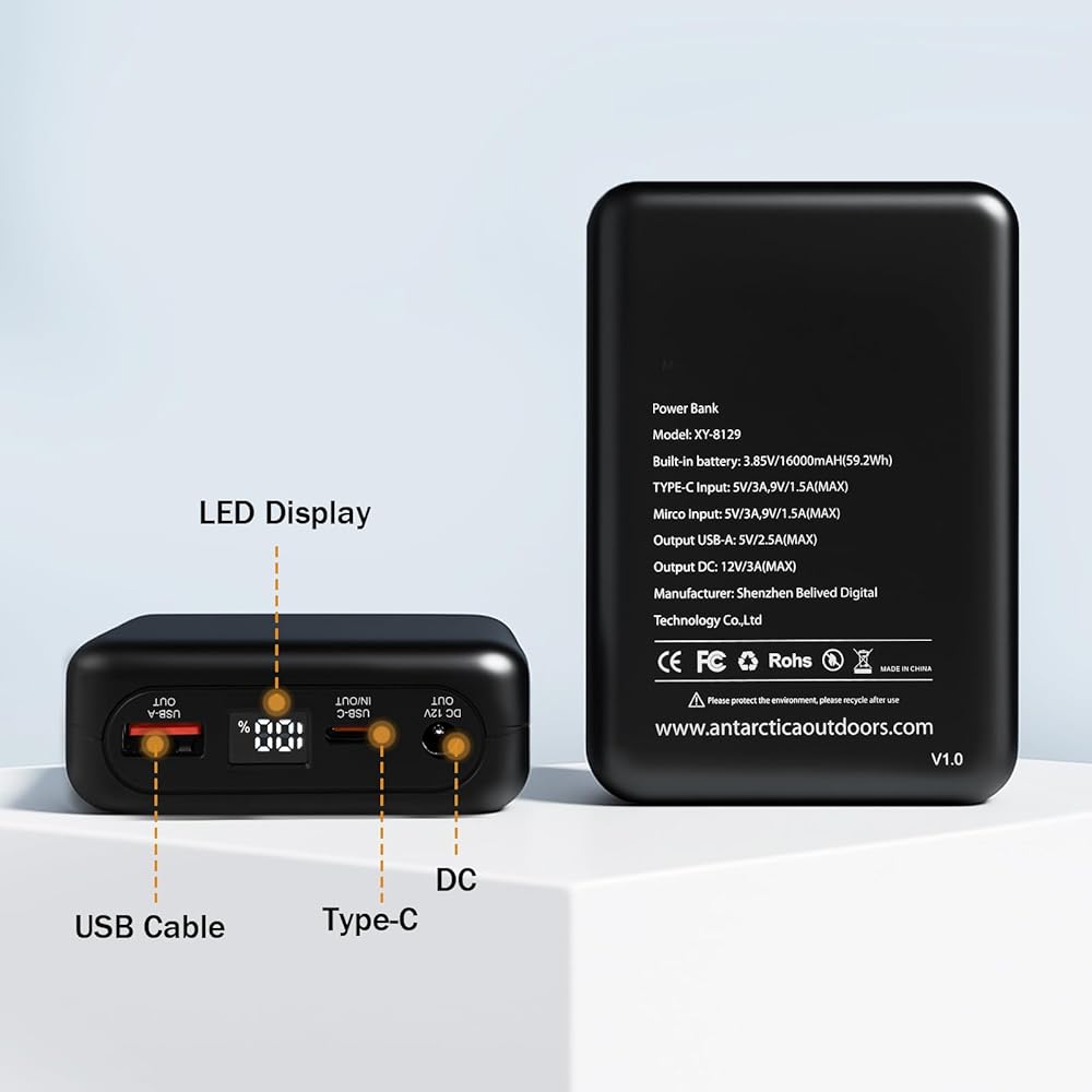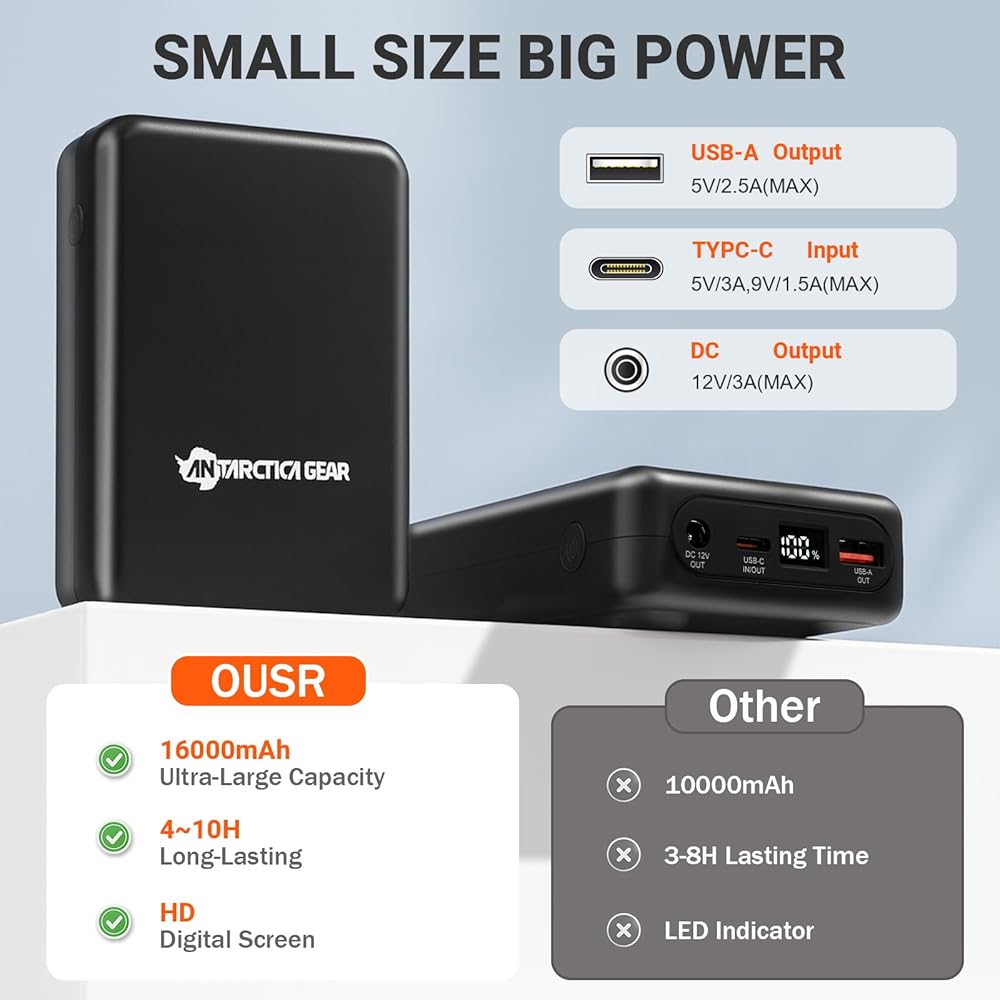 12V DC USB-C Portable Charger:ANTARCTICA GEAR Professional charging, not only for our heated jacket but aslo can use for your smart phone and the other smart device. 3.85V/16000mAH(59.2Wh) high capacity and 12V high output voltage.