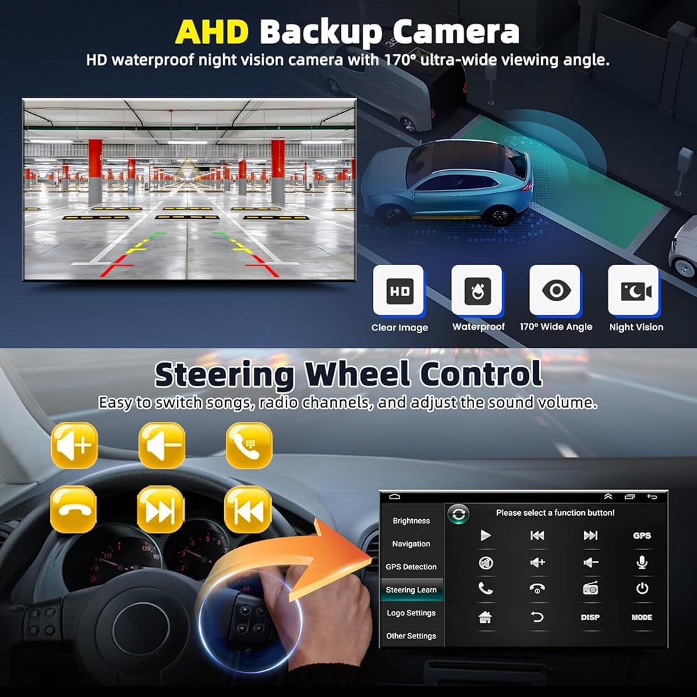 📡 【2+64GB & Multimedia Functions】Equipped with 2GB RAM + 64GB ROM large storage capacity, this aftermarket car stereo supports GPS navigation with offline maps, Bluetooth music, FM radio with RDS, DSP sound processing, and AHD rear-view camera input, creating a balanced in-car entertainment experience.