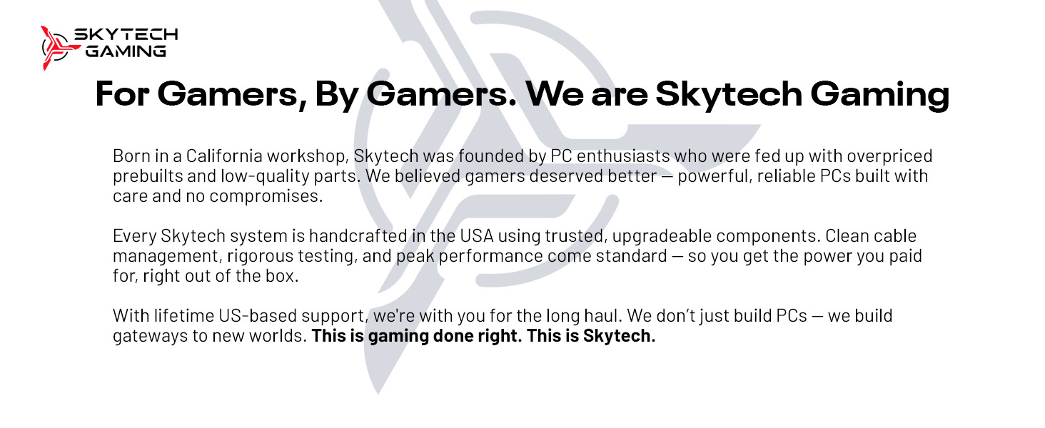 Skytech Gaming is a premier manufacturer of custom and pre-built gaming PCs. With our team of seasoned experts boasting years of collective experience in the industry, we are committed to delivering unparalleled gaming experiences to our esteemed clientele. Our extensive range of gaming PCs ensures that you can select the ideal one tailored to meet your requirements and budget.