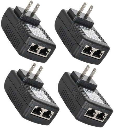 This 4-pack of POE injectors provides 48V 0.5A (24W) power over Ethernet for IP cameras, phones, and network devices. Features include AC 100-240V input, passive POE technology, and built-in overvoltage, short-circuit, and over-temperature protection. Compatible with 802.3af standard devices. Each unit includes a US plug adapter. Package contains 4 injectors. Product is 100% brand new.