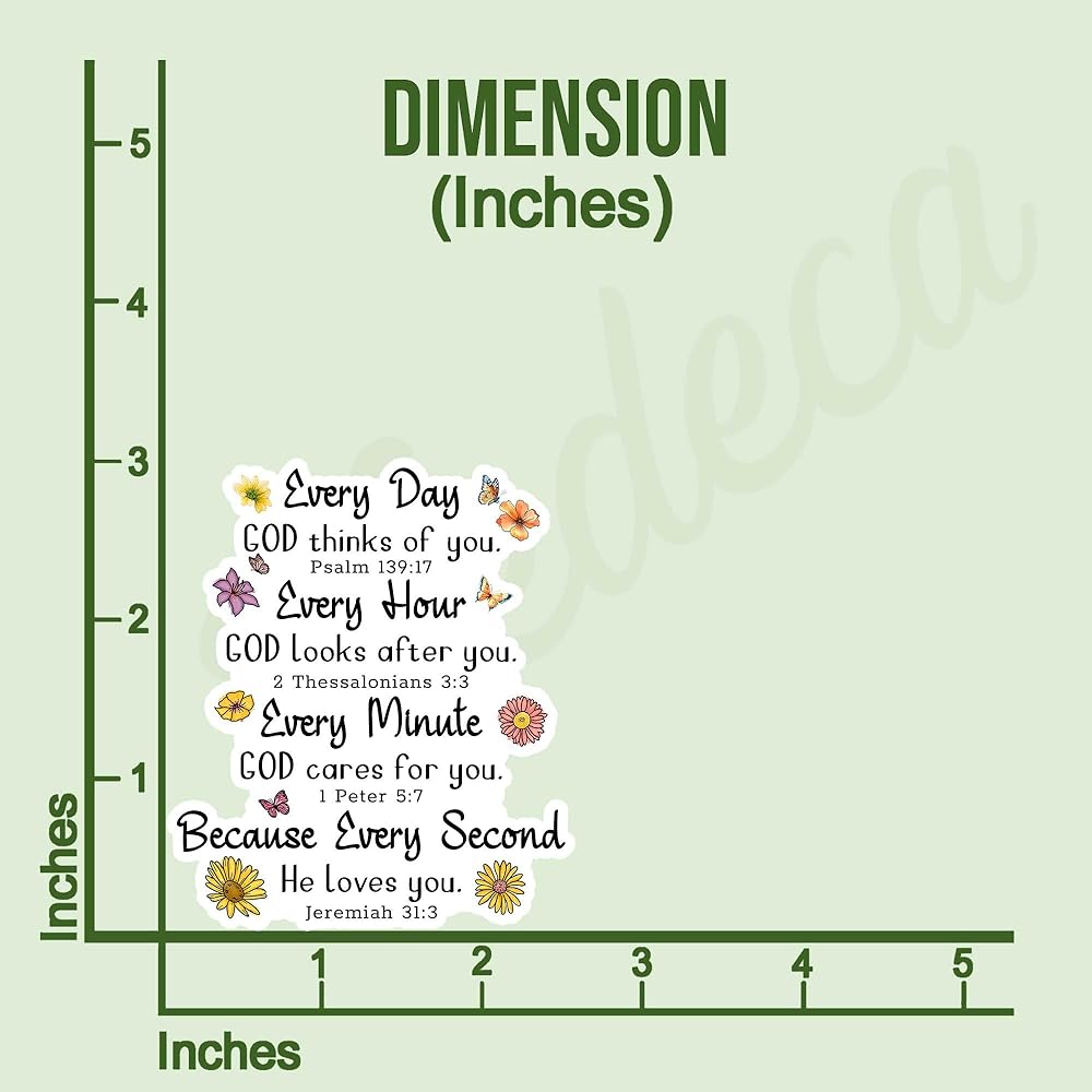 Add a meaningful touch to your space with this beautifully designed inspirational sticker featuring cherished Bible verses. The 3x2.6-inch vinyl decal showcases an artful arrangement of uplifting scripture quotes from Psalm 139:17, 2 Thessalonians 3:3, 1 Peter 5:7, and Jeremiah 31:3, decorated with delicate flowers and butterflies in vibrant colors. This versatile decorative piece is perfect for personalizing laptops, water bottles, tablets, phones, or any smooth surface. The high-quality vinyl material ensures durability while maintaining its vivid appearance, and the kiss-cut design allows for easy peel-and-stick application without bubbles. When it's time for a change, the sticker removes cleanly without leaving residue behind. Ideal for indoor use, this decorative accent works wonderfully as a daily reminder of faith and inspiration. The matte finish provides a sophisticated look that complements any setting, making it a thoughtful addition to your personal items or a meaningful gift for someone special.