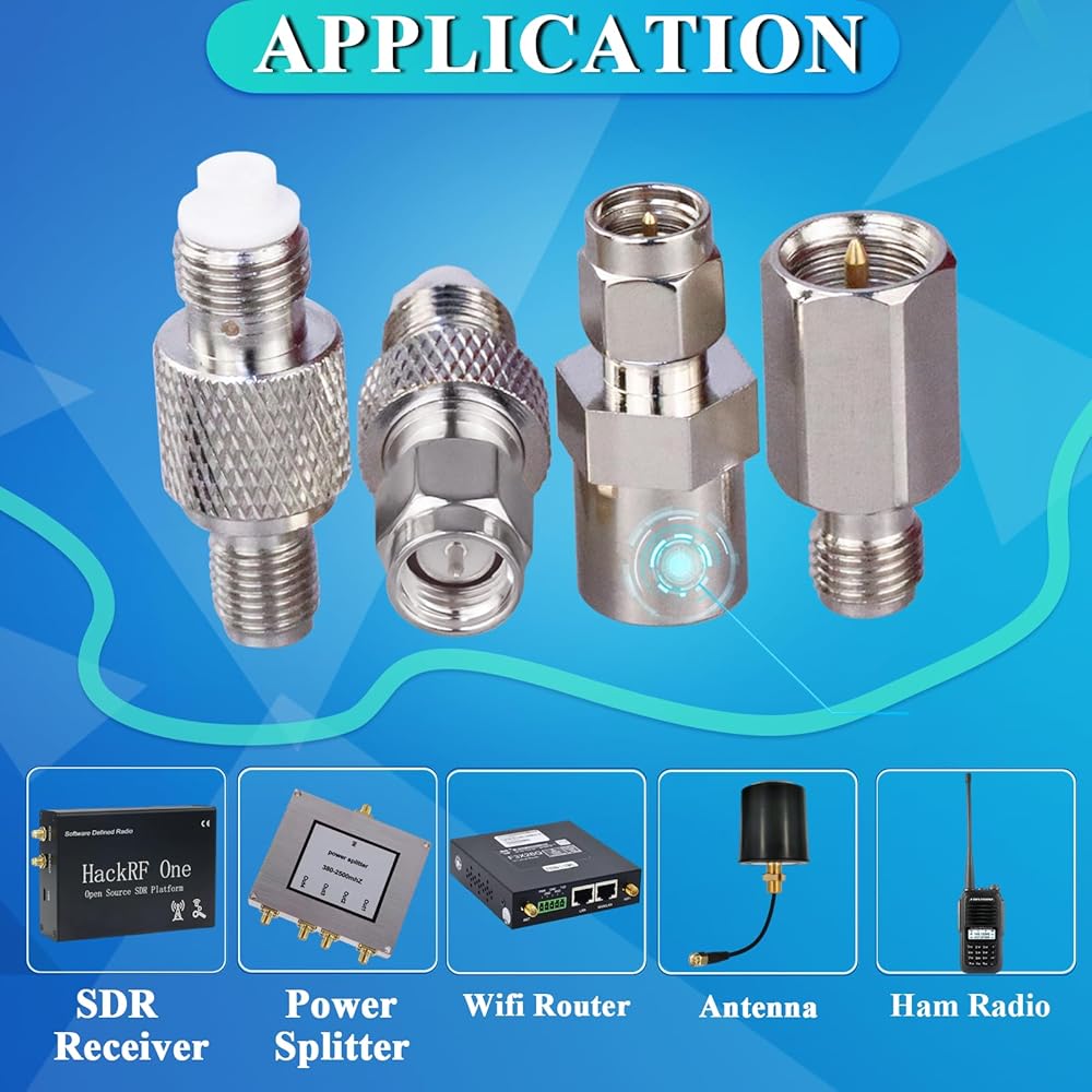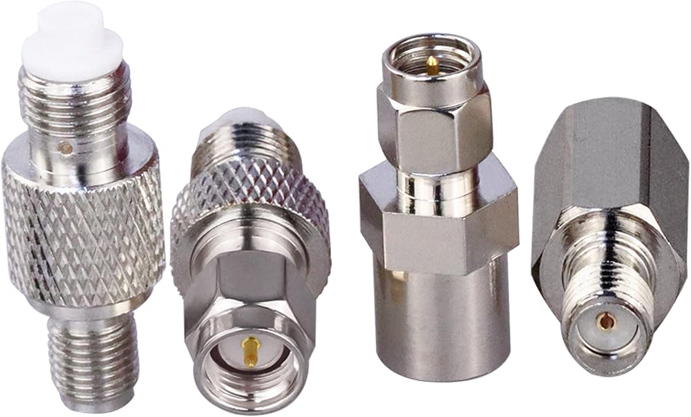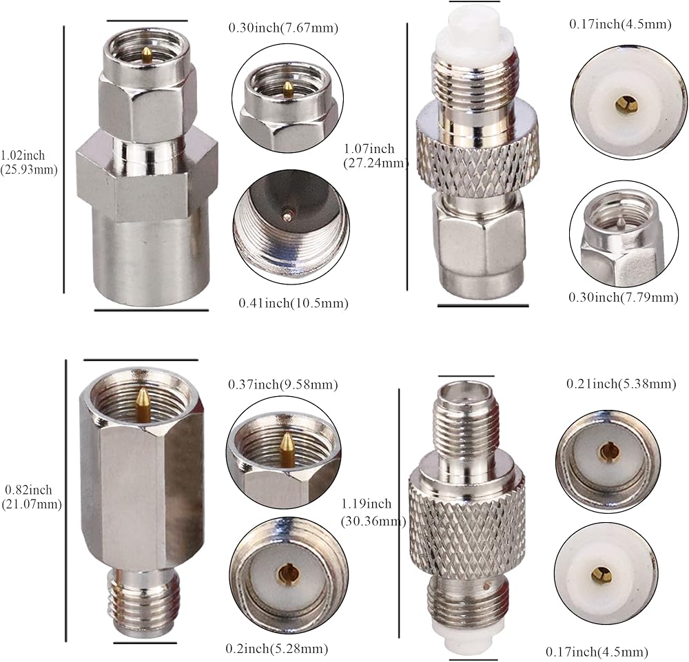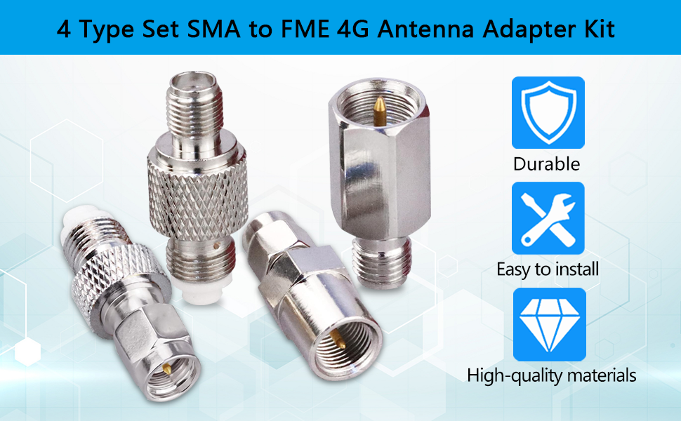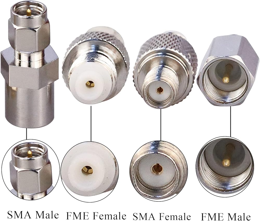 Package Includes: 4 set of SMA to FME connector kit (1 pc of SMA Male to FME Male connector, 1 pc of SMA Male to FME Female connector, 1 pc of SMA Female to FME Male connector, 1 pc of SMA Female to FME Female connector)