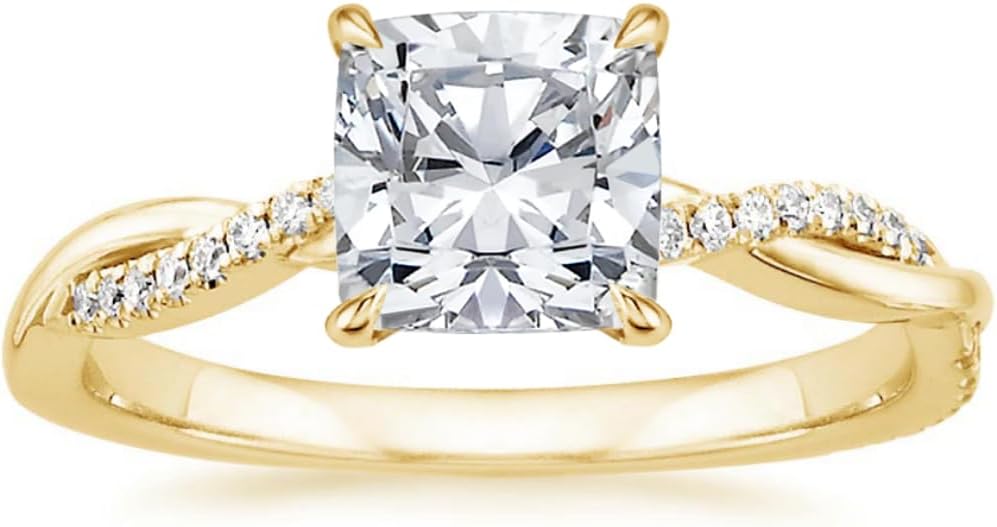 Handmade 2 CT Cushion Cut Colorless Moissanite Engagement Ring for Women Solitaire Wedding Ring Petite Twisted Shank Bridal Anniversary Ring Promise Gifts 10K/14K/18K Solid Yellow Gold