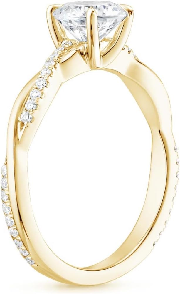 • This beautiful moissanite ring features a petite twisted band with an prong design. Available in 10K/14K/18K solid yellow gold with stamp