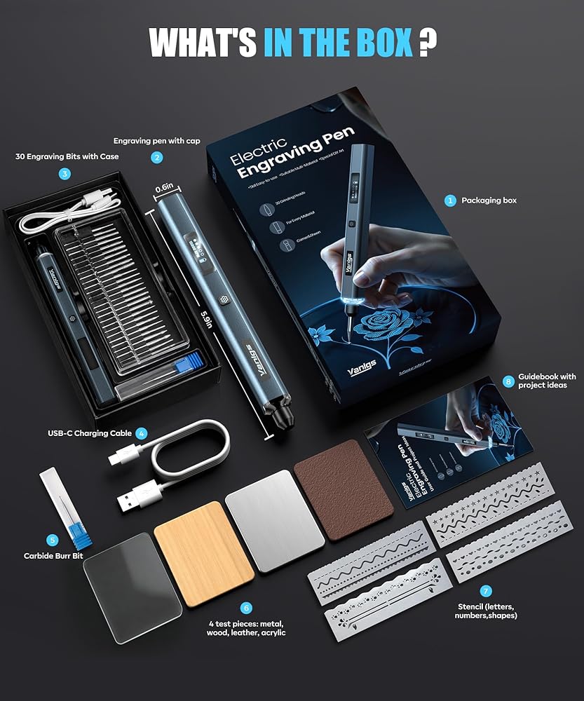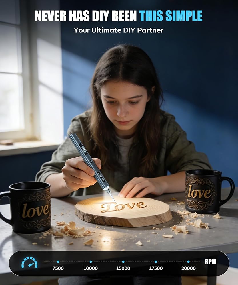 【Precision LED Work Light & 5-Speed Control】Engrave with confidence in the ring light. Our engraving pen features a bright built-in LED ring light that illuminates your work surface, revealing every detail for flawless work on metal, glass, or wood. With 5 adjustable speeds (7,500 to 20,000 RPM), you have the perfect power for delicate shading or deeper engraving, giving you complete creative control