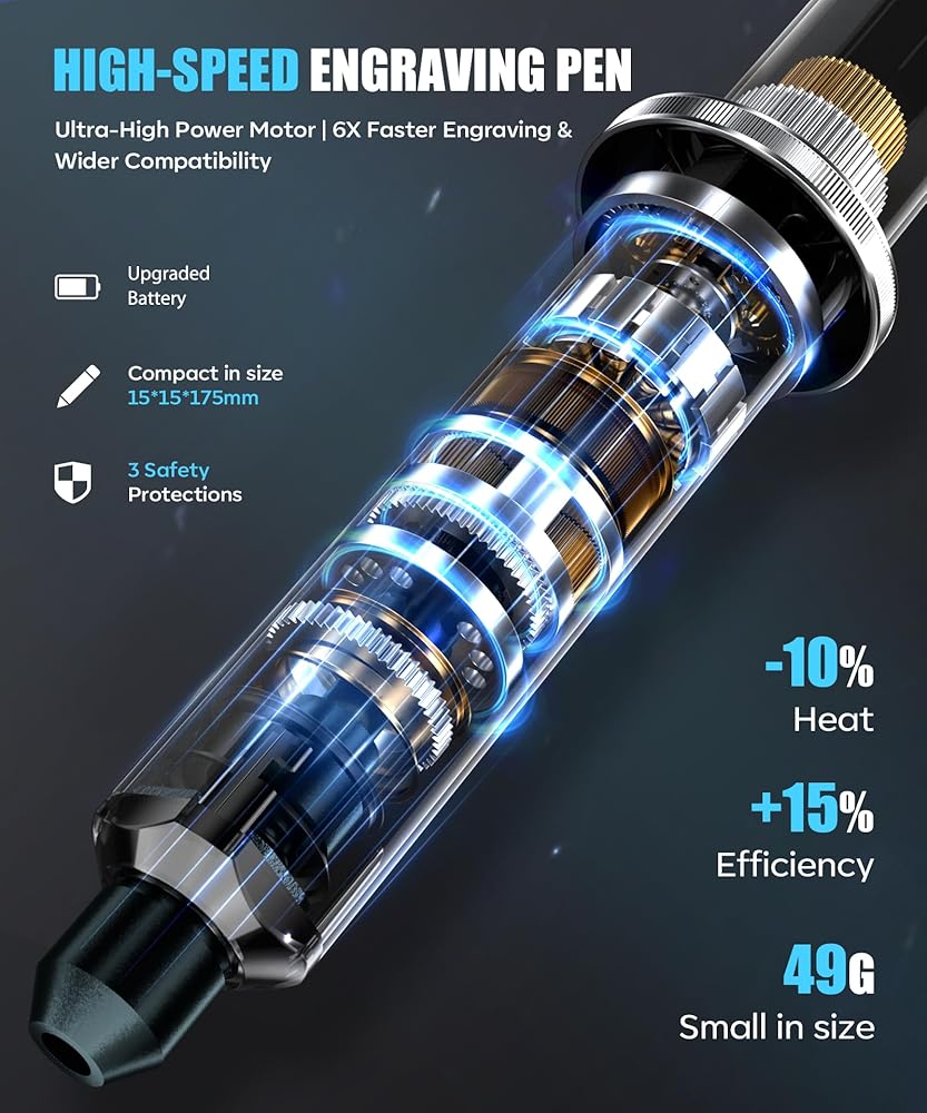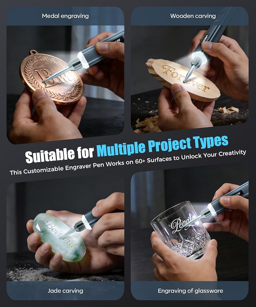 【Beginner-Friendly & Ergonomic Design】Perfect for first-time craft lovers and teens. The lightweight (49g), pen-shaped body is easy to grip and maneuver like a regular pen, reducing hand fatigue. It's the ideal cordless engraving pen for beginners to learn etching and engraving techniques and bring their personalized gift ideas to life