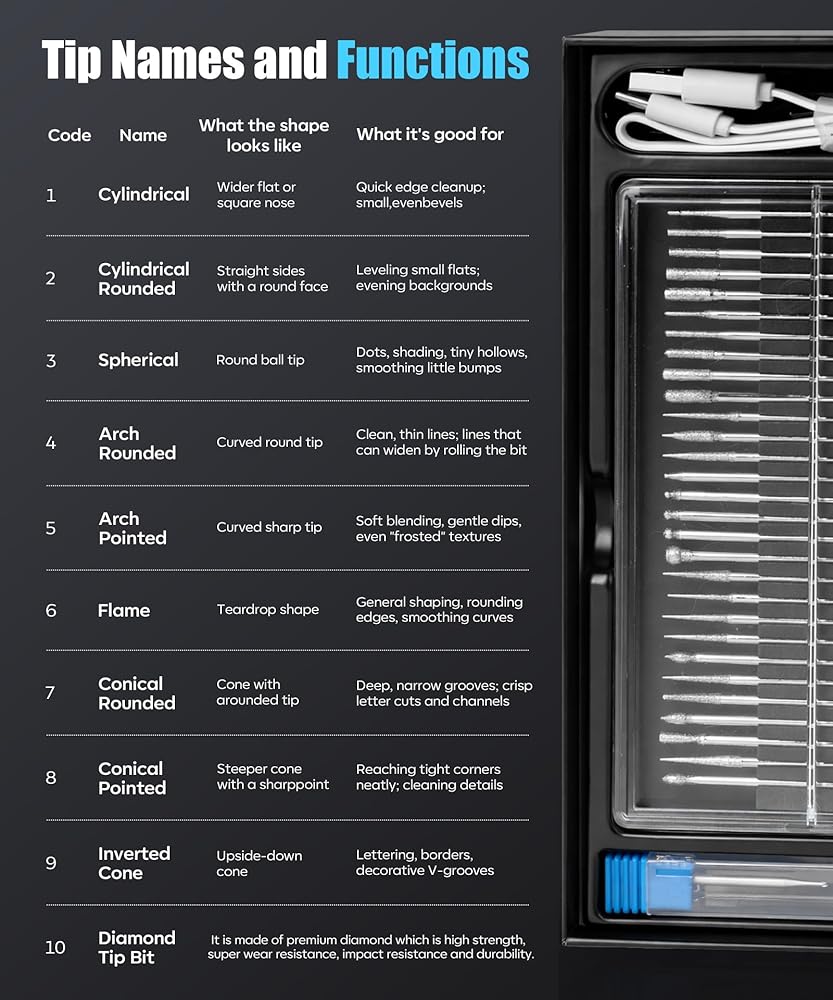 【Complete 31-Piece Professional Bits Kit】Start creating immediately. This all-materials engraving kit comes with 31 durable bits designed for different textures and finishes. From fine points for intricate designs on glass to robust shapes for wood carving, you have the right tool to personalize jewelry, tumblers, tools, and countless DIY projects