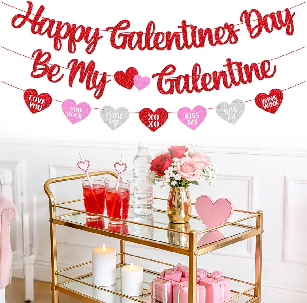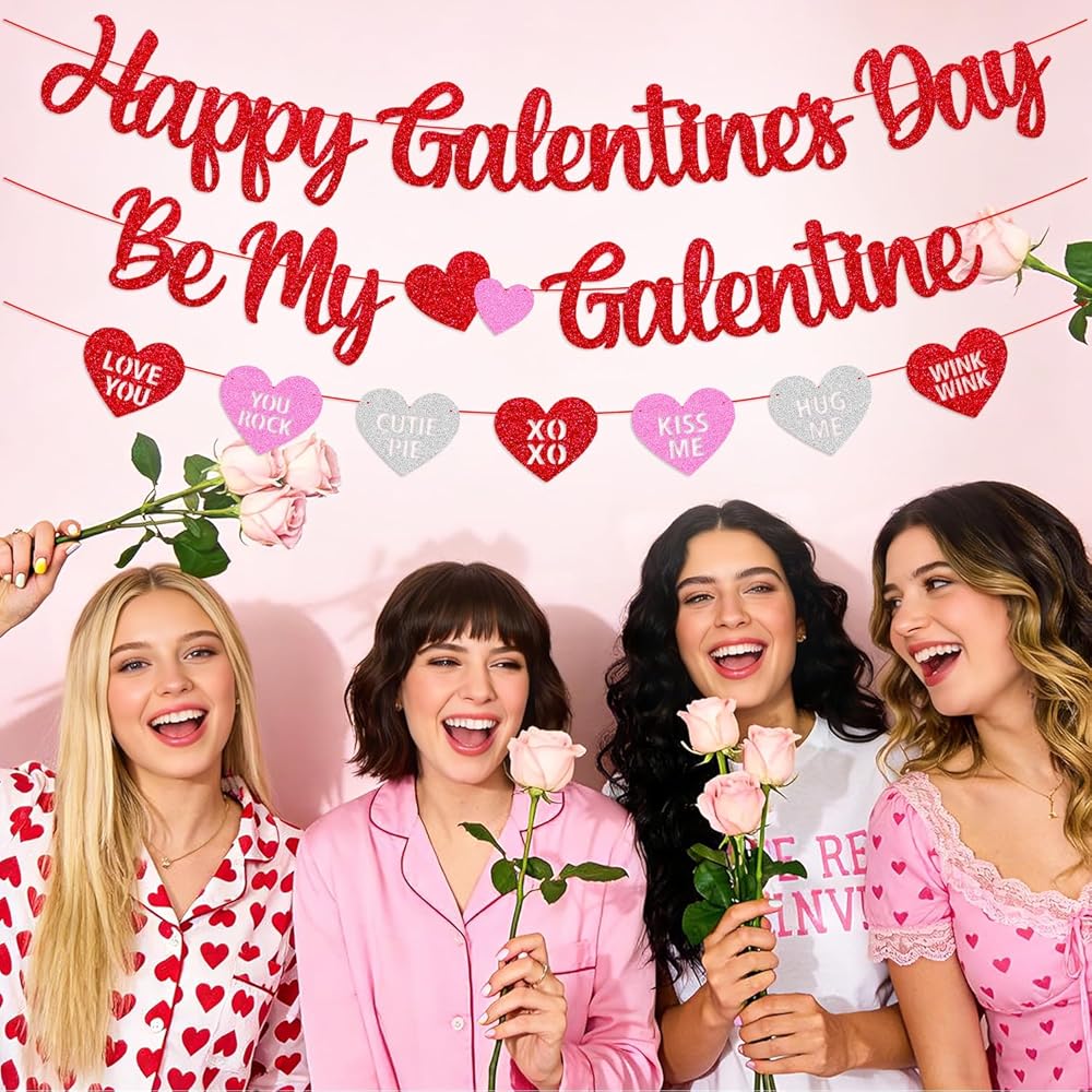 Make your Galentine's Day sparkle with our Happy Galentine's Day Be My Galentine glitter banner set. Designed for friendship, fun, and photo-worthy moments, this three-piece set includes: "Happy Galentine's Day" Banner - Celebrate the holiday dedicated to your best girlfriends. "Be My Galentine" Banner – Invite your friends with playful, feminine script lettering. Conversation Hearts Banner – Seven colorful heart shapes with cutout messages like "LOVE YOU" and "YOU ROCK" for extra charm. Crafted from premium, no-shed glitter cardstock in red, pink, and silver, every piece comes pre-strung with red string, ready to hang immediately. Each banner is approx. 49 inches long with adjustable spacing for a perfect fit anywhere. Ideal for brunches, gift tables, office parties, or virtual celebrations, this glitter banner adds sparkle, joy, and a memorable backdrop for your Galentine's Day photos. Celebrate friendship in style and make your girls' night unforgettable!