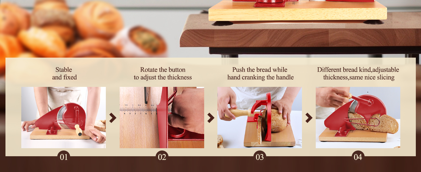 【Vintage Manual Bread Slicer】Enjoy the vibe from Cream, Red, or Black Metal housing and beautiful Wood Grain. Features a detachable blade with included brush enables 80% faster cleanup, while the one-handed knob adjusts thickness effortlessly.