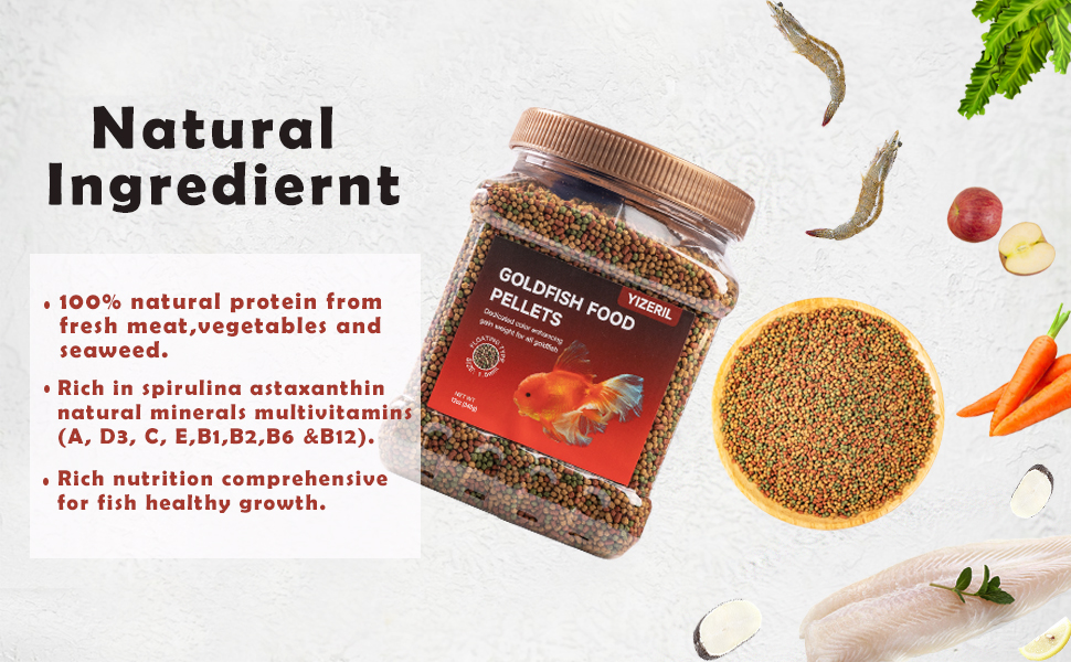 High Quality Ingredients : Our gold fish food is made from carefully selected natural ingredients, which are derived from fresh meat, vegetables and seaweed. No additives, artificial flavors, colors and other harmful ingredients. The main ingredients are Fresh fish, Antarctic krill, Astaxanthin,Spirulina, Wheat, Deep-sea fish oil, Carrots, Natural minerals, Vitamins(A, D3, C, E,B1, B2, B6 &B12)
