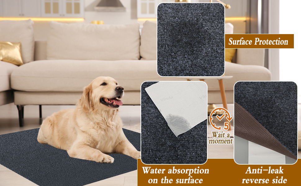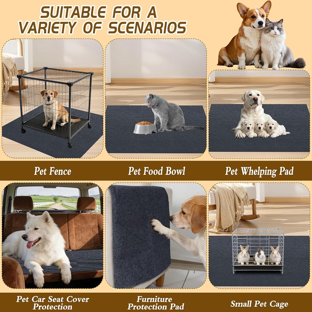 Premium Materials: This dog playpen mat is made of premium carpet material, soft and comfortable, with a rubber backing. The surface material is highly absorbent, preventing urine from seeping onto the floor and providing waterproof protection. It effectively prevents moisture penetration. The backing of the dog cage mat is non-slip and durable