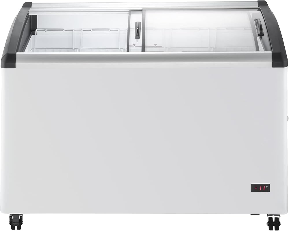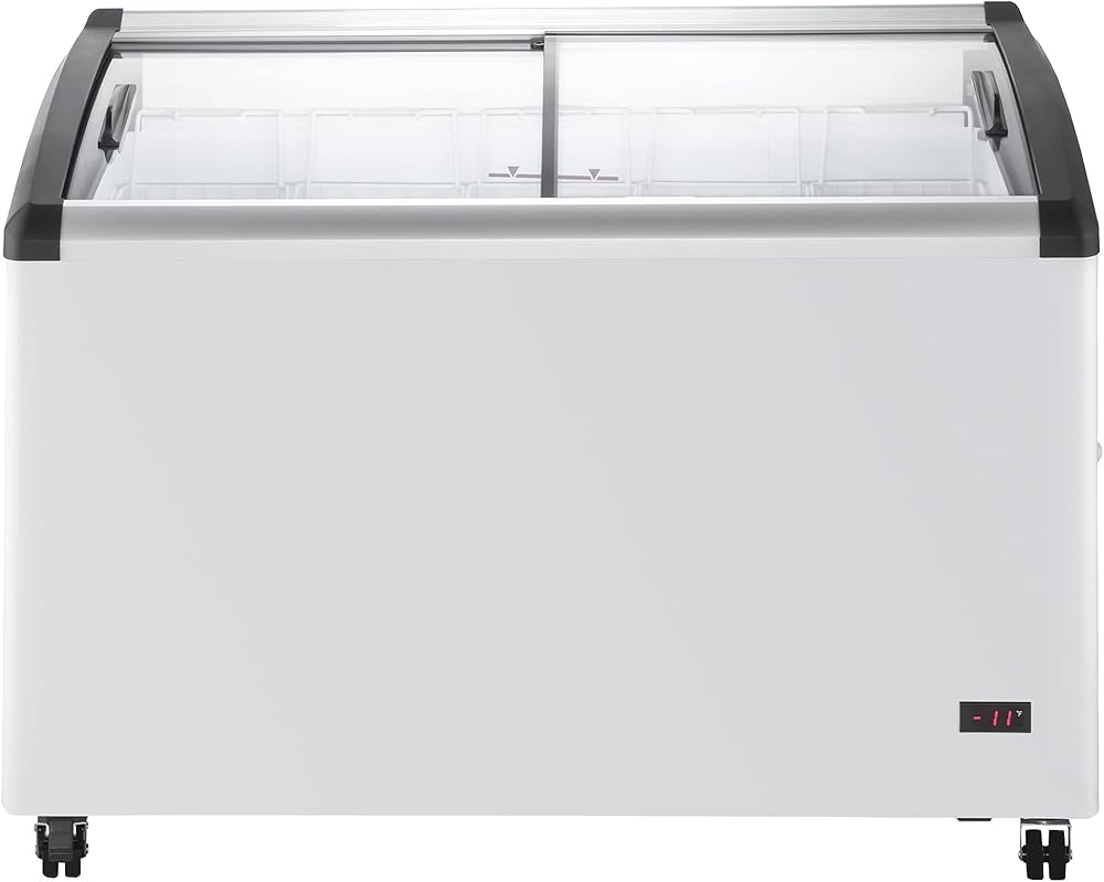 This mobile ice cream display freezer offers an attractive way to display ice cream and other frozen food or dessert products to improve sales! These cabinets reach extra cold temperature allowing you to hold hand-dipped ice cream or novelties like popsicles, ice cream sandwiches, frozen candy bars, prepackaged ice cream treats, pizza, prepared meals, fruits, vegetables, and more. The flat sliding glass top allows customers to easily view and access your offerings for increased impulse sales. Heat-reflective glass, thick 2.5 inch insulation, and an easy to use manual controller ensures a consistent temperature, keeping cold desserts at the perfect consistency while maintaining strict sanitation standards required for its commercial NSF approval. The units include locking sliding lids standard so you can secure the contents inside when not attended for peace of mind. A drain plug inside the floor of the unit allows for easy manual defrost and cleaning. The unit is equipped with a standard household NEMA 5-15P power cord that will run on 115V electric, for easy plug-and-play installation. Perfect for ice cream parlors, convenience stores, restaurants, sorbet and gelato shops, delis, cafes, concession stands, or even your home kitchen or garage.