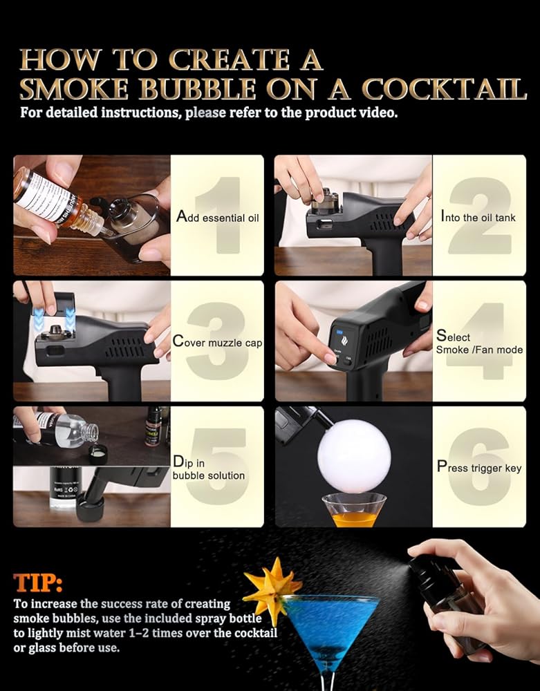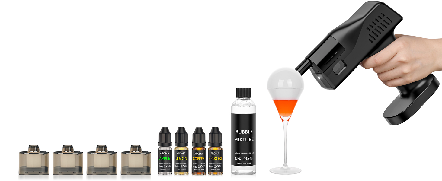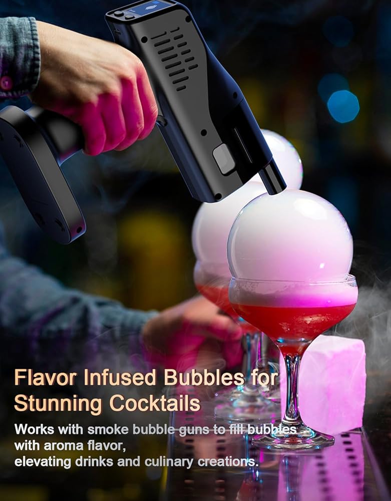 Use with Our Aroma Refills for Flavor Bubble: Bubble mixture is flavor-neutral and paired with our aroma refills (apple, lemon, hickory, coffee). Simply inject the aroma into the bubbles to infuse your drinks with rich and unique scents, creating an elevated and personalized cocktail experience.