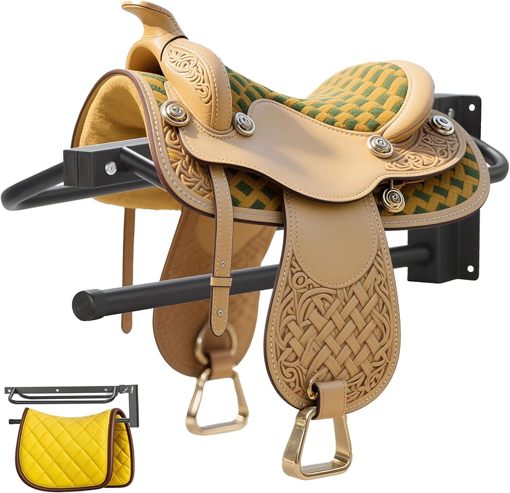 HEAVY-DUTY MATERIAL:Crafted from high-quality alloy steel, this wall-mounted saddle rack features a rust-resistant coating. Its smooth surface prevents scratches on your valuable saddles, and the robust build ensures long-lasting use, perfectly meeting the demands of a functional wall-mounted saddle storage solution.