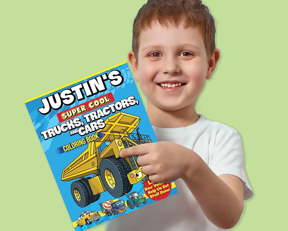 This super cool custom coloring book packed with awesome vehicles for kids to color and is the perfect personalized gift for someone special in your life. Just fill out the customization options to add the recipient's name to the front cover, as well as a short message from you that will be printed on the inside front cover dedication page.