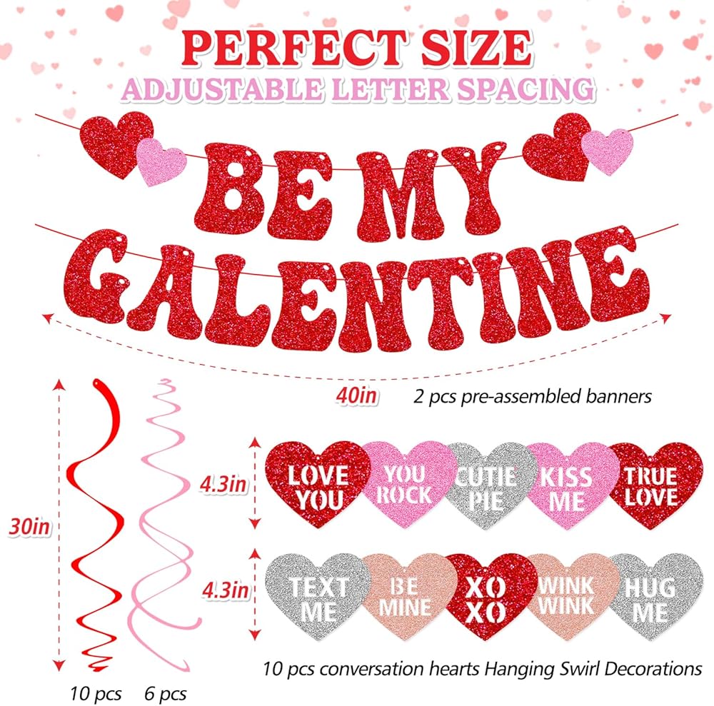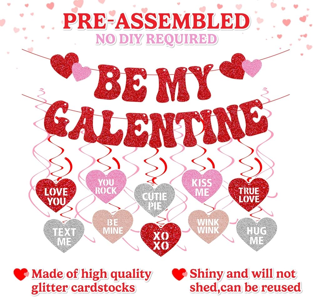 • PREMIUM QUALITY: Be my galentine banner with hanging swirls decorations is made from premium quality glitter red card stock, creates an eye-catching Valentine's Day display