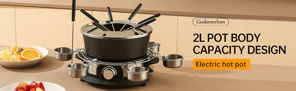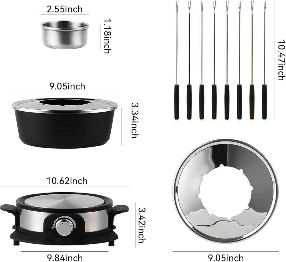 Perfect for Small Gatherings:This electric cheese fondue set features a 2L capacity pot and comes with 8 color-coded, heatproof forks. Its generous size makes it ideal for enjoying with multiple guests, whether at family gatherings, camping trips, or picnics. The forks can be securely held in place by notches in the pot cover's rim. Plus, its compact dimensions (9”L x 8”W x 6”H) ensure it takes up minimal space.
