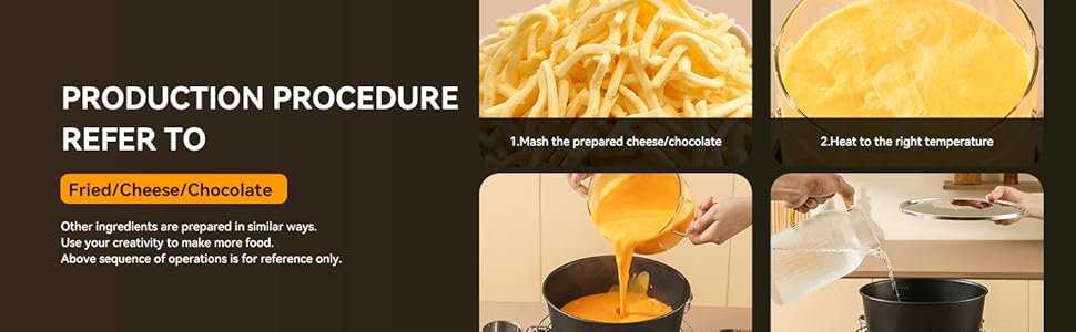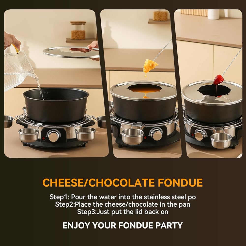ALL TYPES OF FONDUE - The temperature of electric fondue maker can be controlled easily with knob, so it can be used for different types of fondue: classic burgundy fondue, cheese fondue, chocolate fondue,oil fondue.Great for dipping fruit,bread,vegetables,meat,marshmallows and more food.