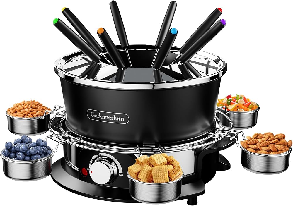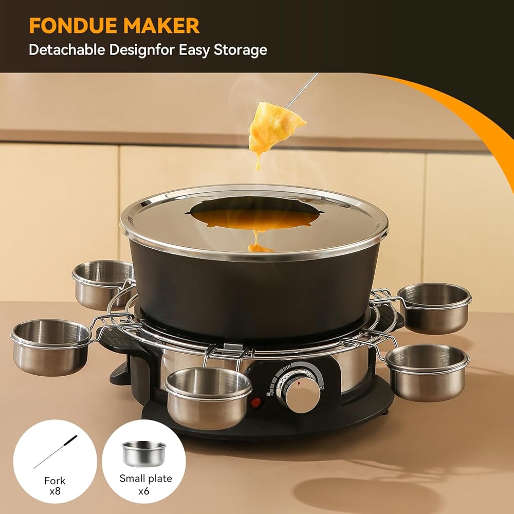 Electric Fondue Pot Set for Chocolate, 1300W Cheese Fondue Set with Multiple Fondue Pots with Adjustable Temperature, 8 Color-Code Fondue Forks, Serve 8 Persons (with 6 plate)