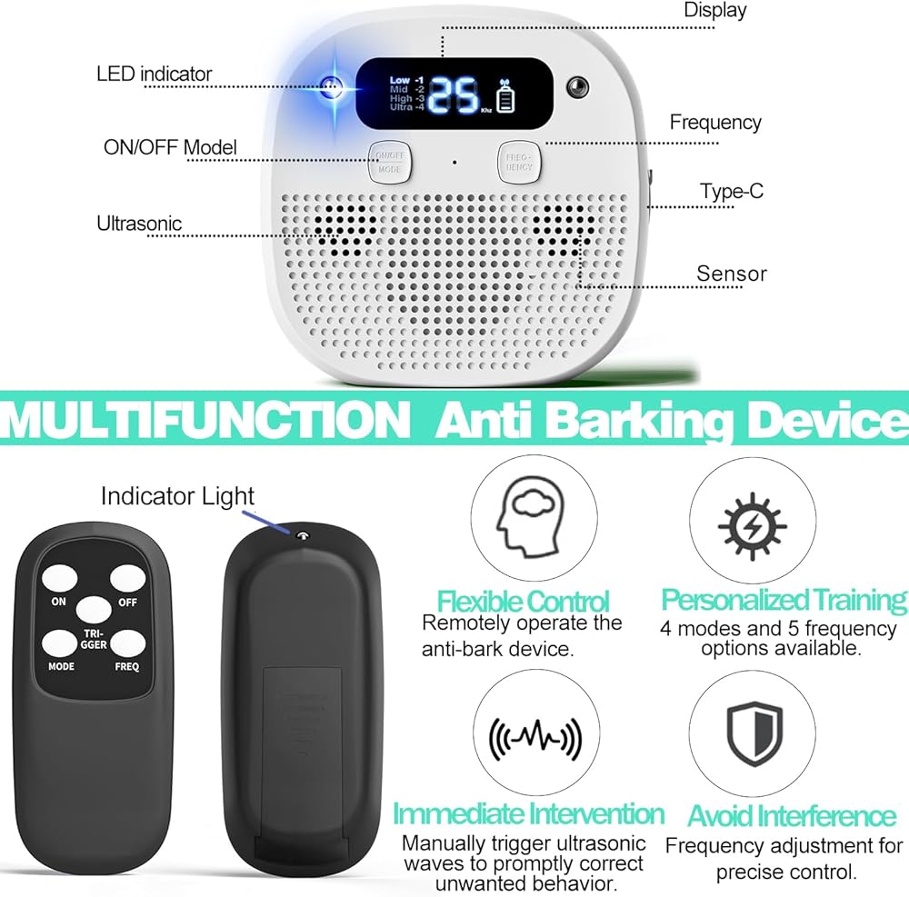 Advanced Features for Effective Training Our dog barking deterrent devices includes a built-in display screen for real-time monitoring and easy mode adjustments. With its high-sensitivity sensor and adjustable ultrasonic output, this no barking device for dogs is not only effective for deterring barking but also serves as a powerful tool for training your dog to behave calmly in various situations.