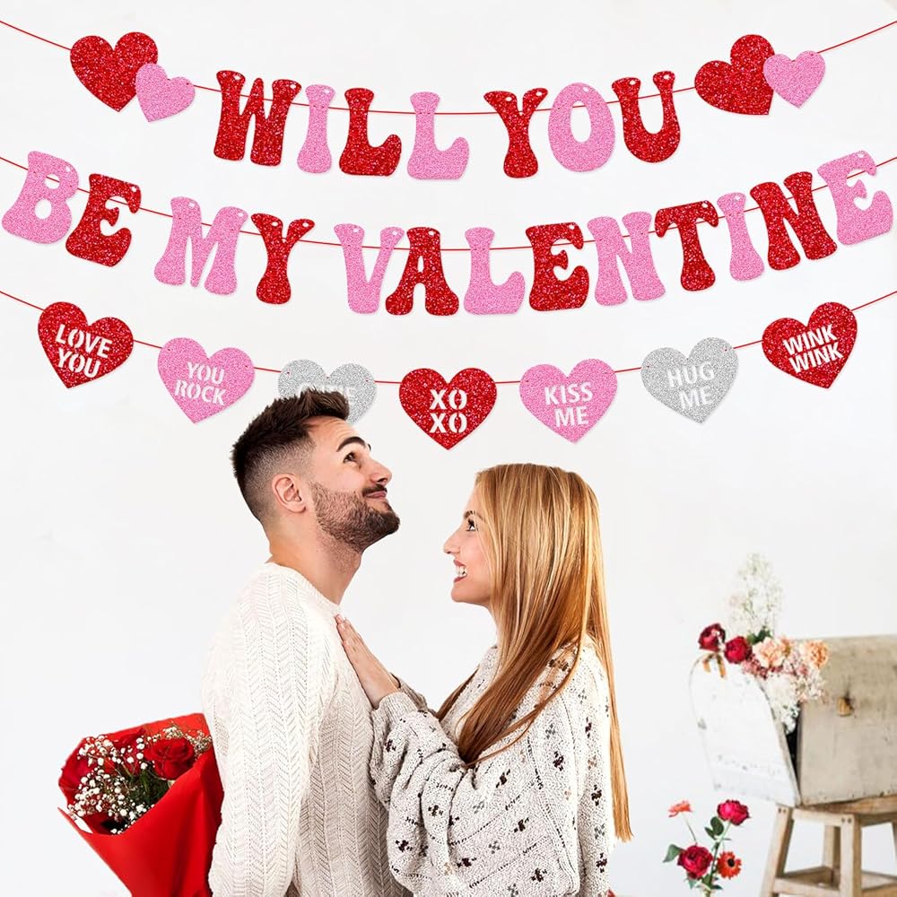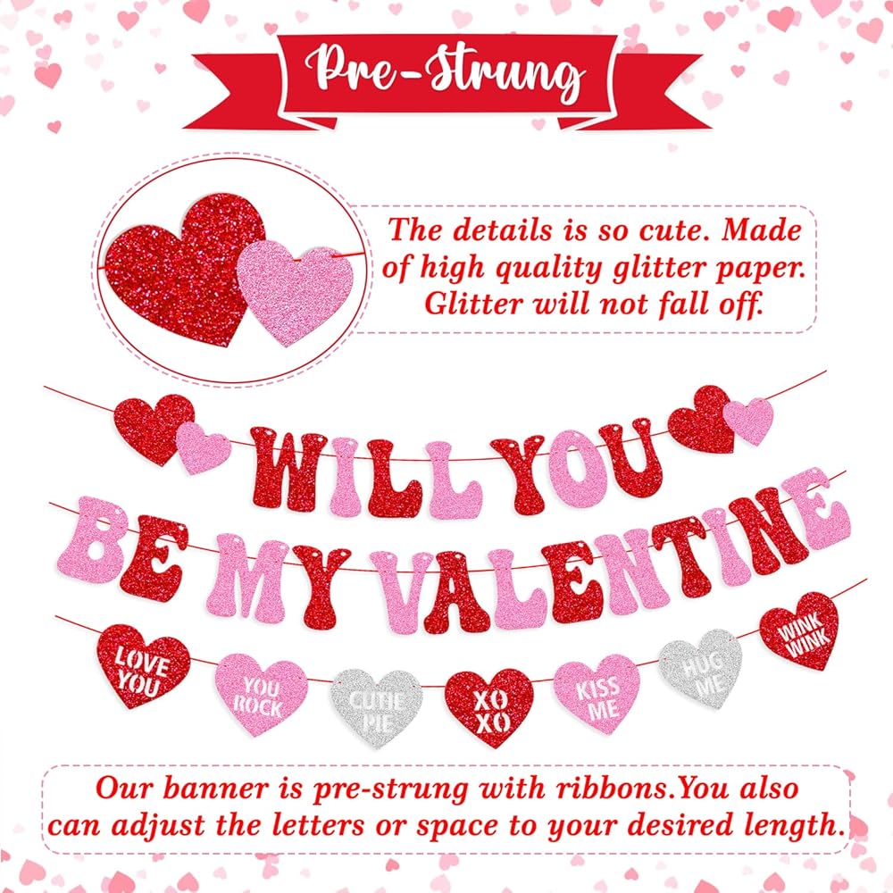 Festive Banner: This colorful banner features the phrase 'Will You Be My Valentine' in alternating red and pink letters, perfect for celebrating Valentine's Day.