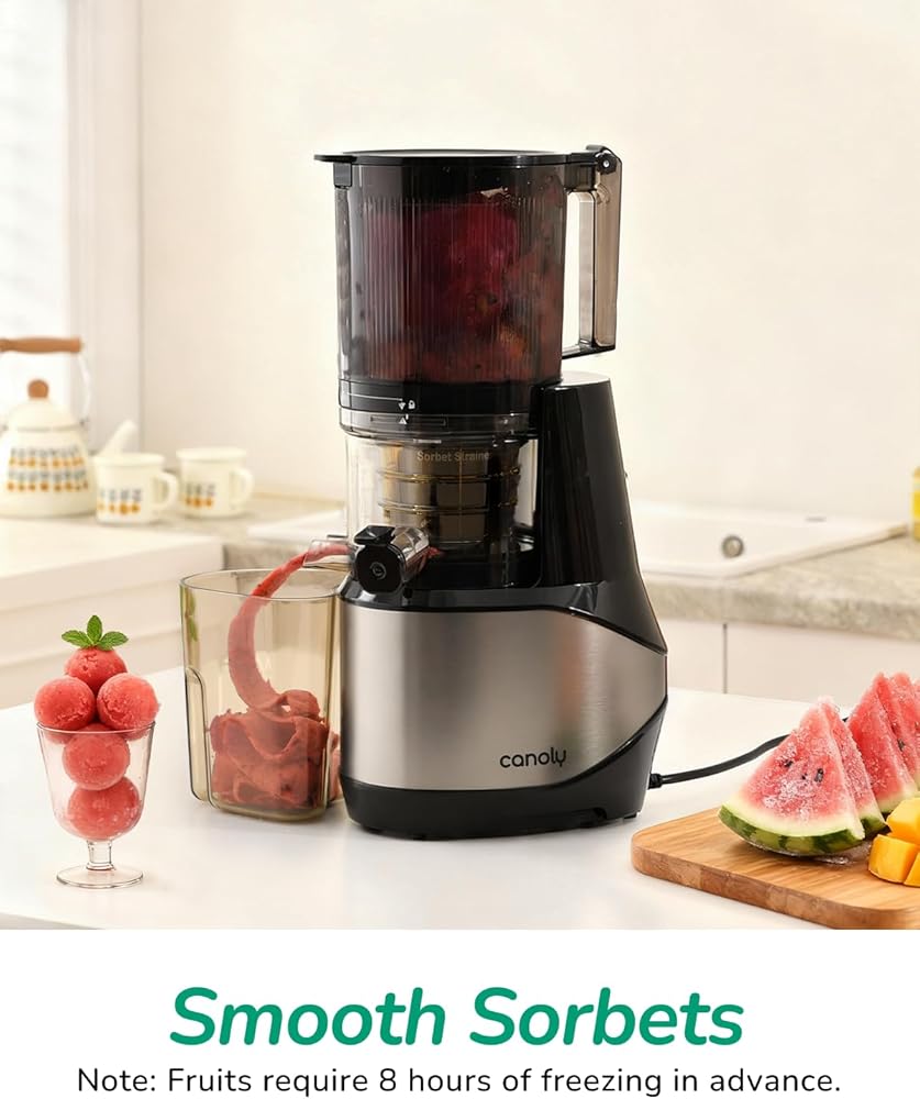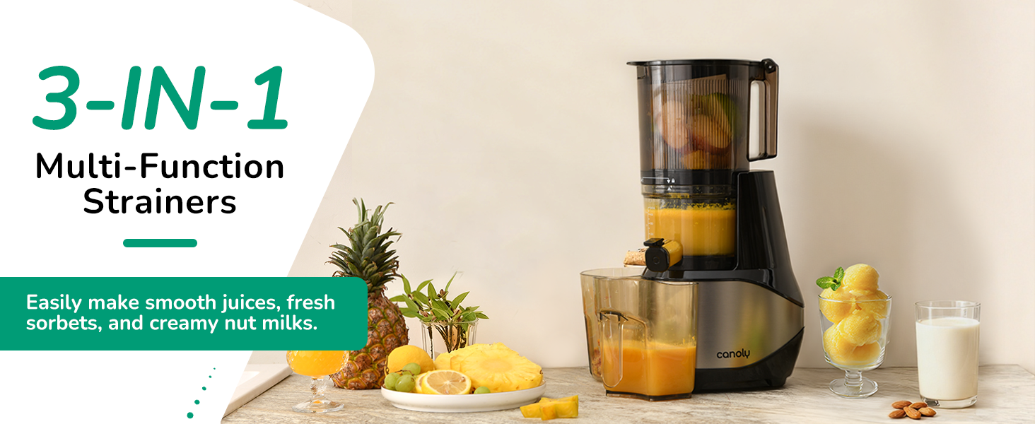 عصارة Canoly C09 3 في 1 متعددة الوظائف: تتميز بمصفاة (عصير وسوربيه) لتحضير عصير الفواكه/الخضروات الطازجة وحليب الجوز الكريمي وأشربة الفاكهة المجمدة بدون نفايات. آلة واحدة لجميع الاحتياجات الصحية لعائلتك.