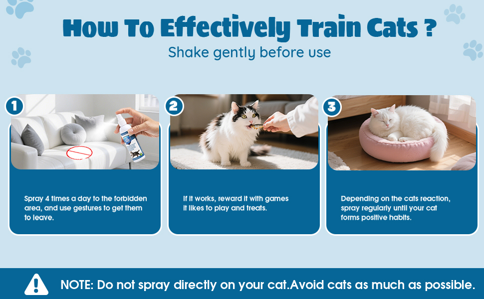 Easy to use: Shake gently before use and spray evenly in areas where you want your cat to stay away. It is recommended to spray 3-4 times a day initially (effect varies depending on the environment and the cat's habits). Adjust the frequency of use based on your cat's reaction later.
