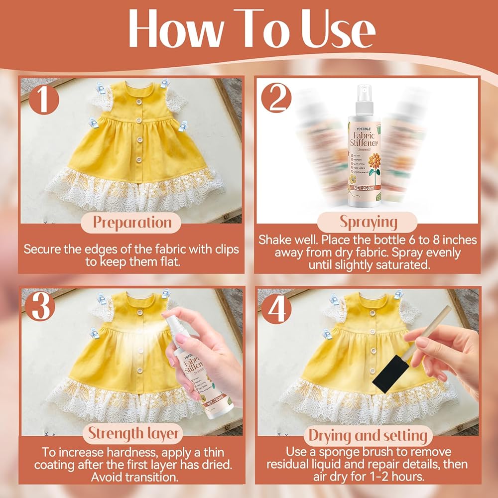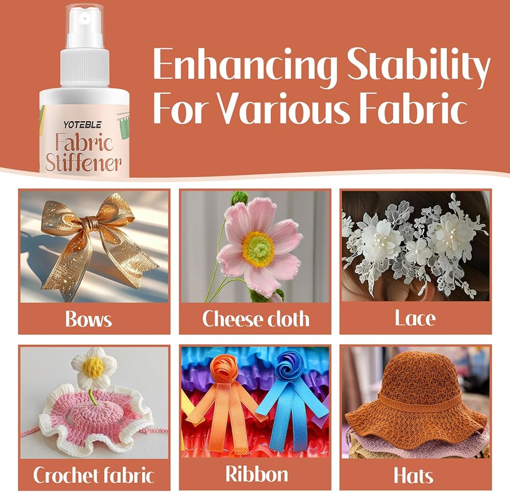 Our fabric stiffener is the ultimate solution for adding structure and elegance to delicate materials. This versatile spray delivers a fine, uniform coat that dries crystal clear—never altering your fabric's color or delicate feel.