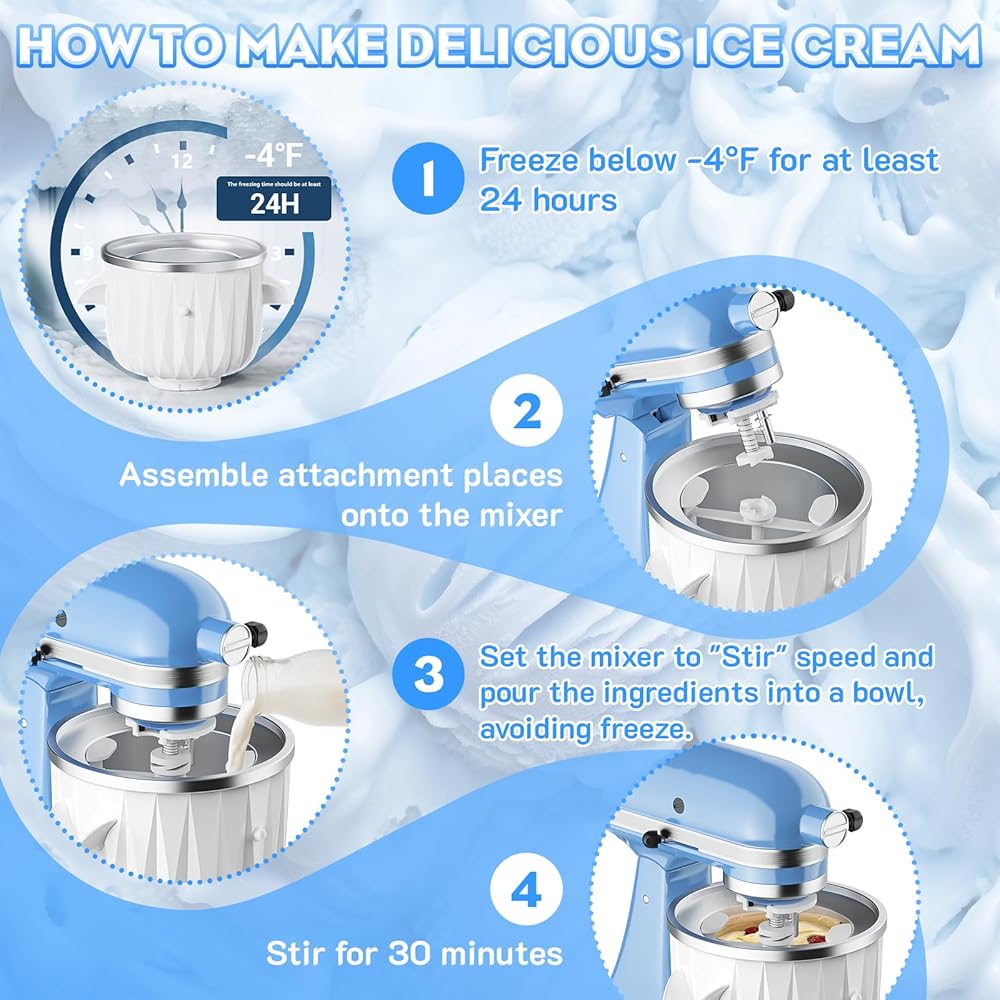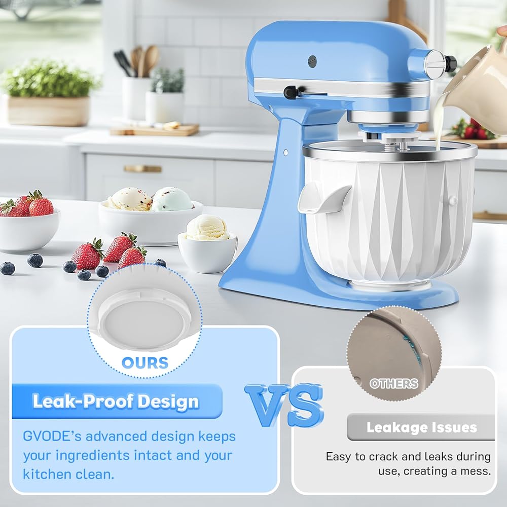 Food-Grade Materials: The inner liner of this KitchenAid mixer attachment is made of rust-free aluminum alloy, and the plastic shell is PVC—both food-grade materials that ensure no leakage or breakage even with long-term use; important note: do not use metal spatulas or utensils to scoop ice cream, as this will damage the inside of the freezer bowl.