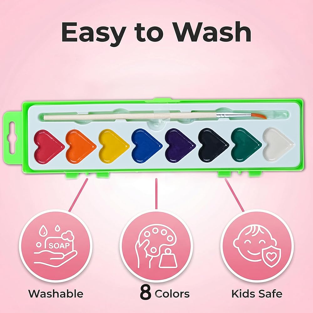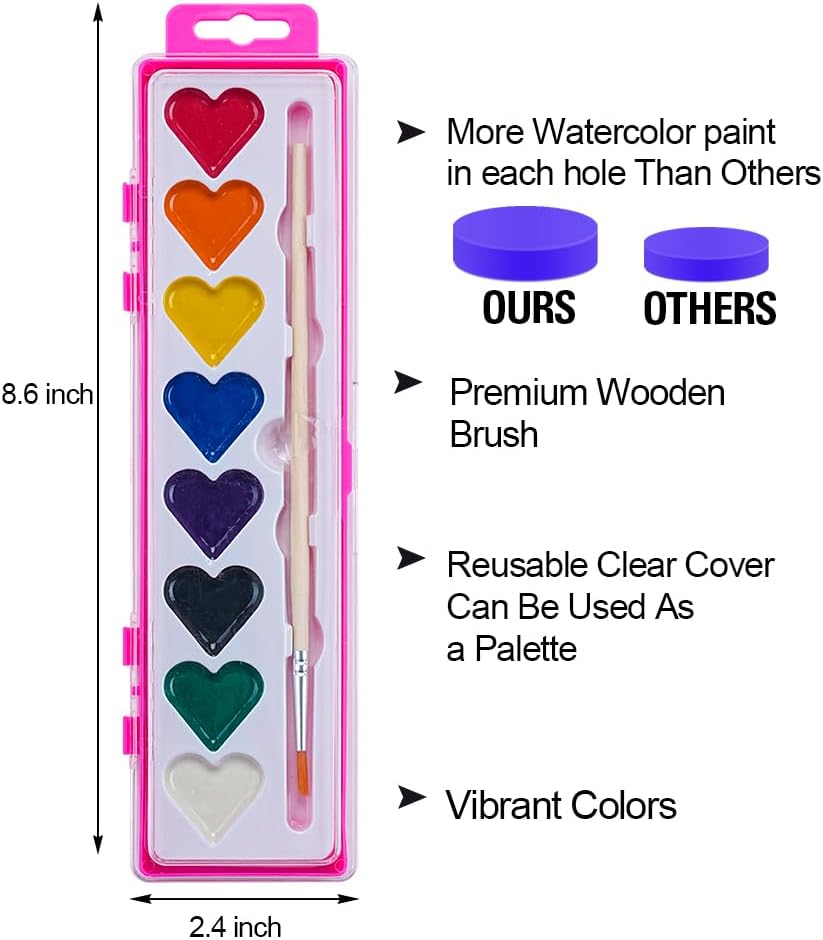 Watercolor Paint Sets, 24 pack 8 Colors Heart Washable Paint Sets,Wooden Brushes, Idear Valentines Day Gift for Preschool Classroom, Art School, Birthday Party
