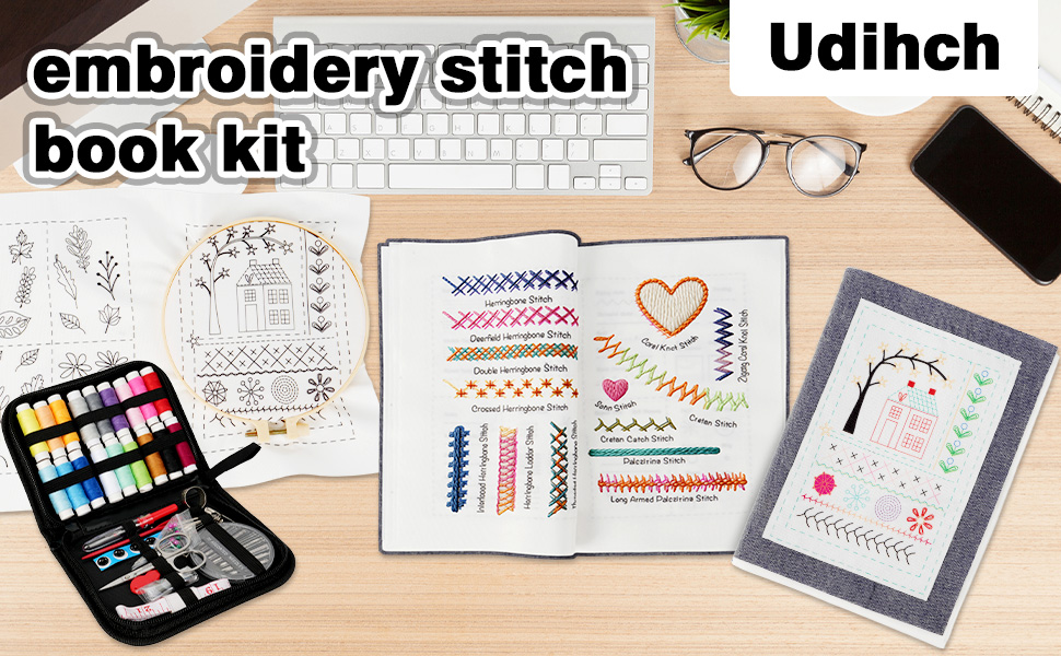 Udihch Embroidery Stitch Book Kit (86 PCS), Embroidery Patterns with Step-by-Step Tutorials, Portable Sewing Toolkit, Includes Floss and Needles, Suitable for Beginners and DIY Craft Enthusiasts