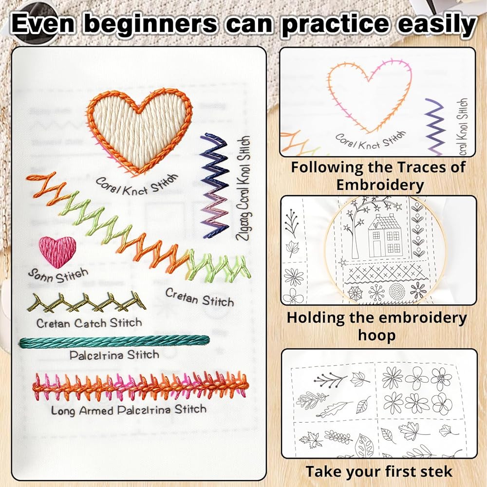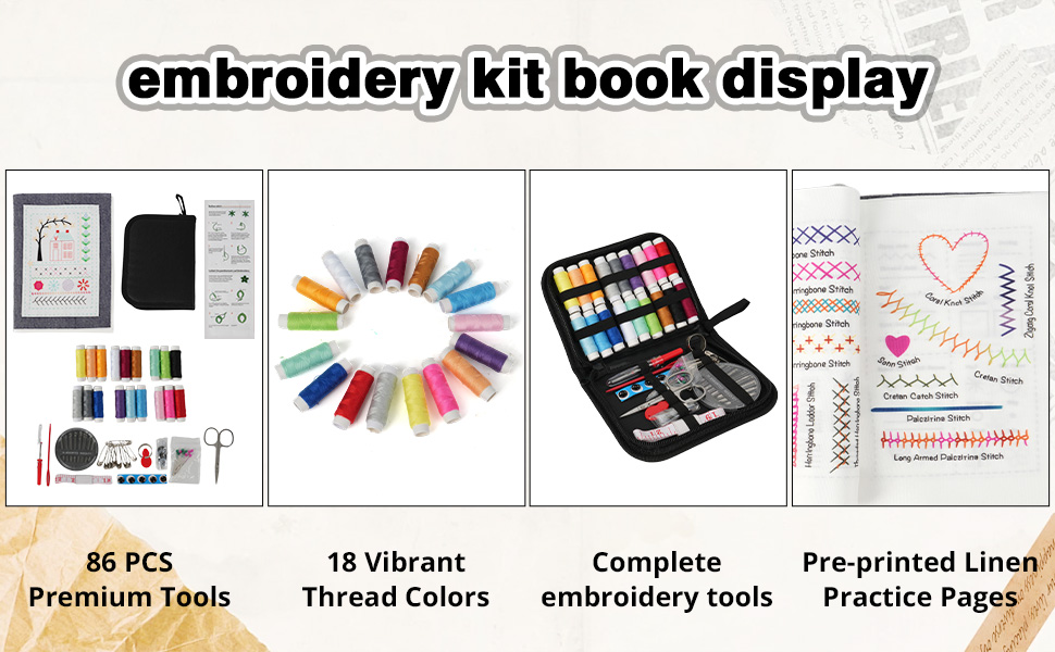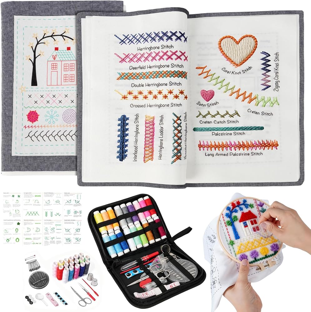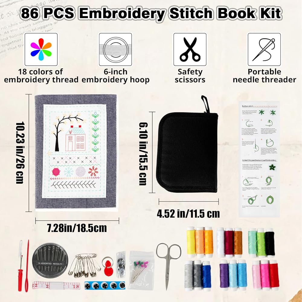 Complete Embroidery Toolkit Book: This embroidery stitch book kit sampler comes with a 6-inch hoop, 18 vibrant threads, needles, scissors, needle threader, and 86+ tools. Perfect for embroidery book kit enthusiasts seeking ready-to-use supplies