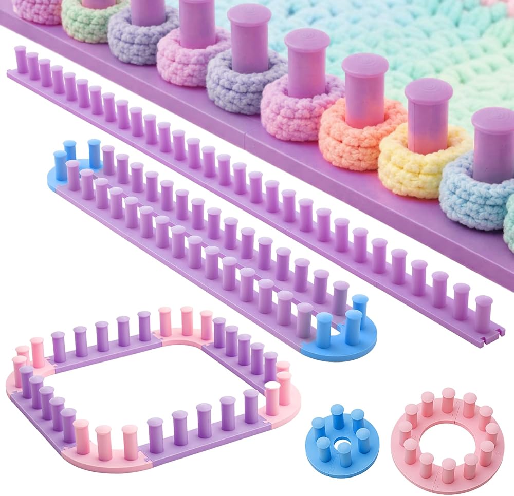 • One Piece Chunky Knit Blanket Set: this set assembles into a 64 inch plastic loom, consisting of 4 pcs 16 inch straight plastic loom frames, 2 pcs semicircles, and 4 pcs quarter circles; Matching pegs are included; The straight strips and quarter circles can be combined to form squares, allowing for free combination to create knitting projects of various sizes