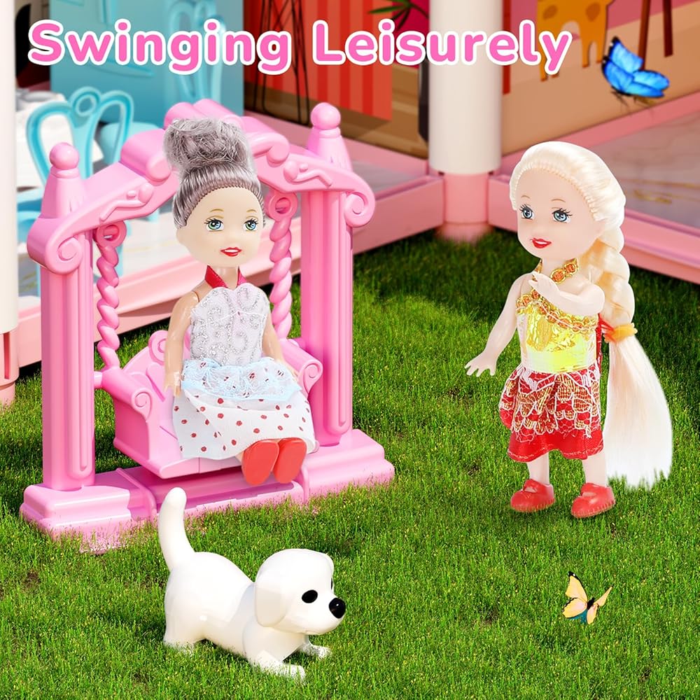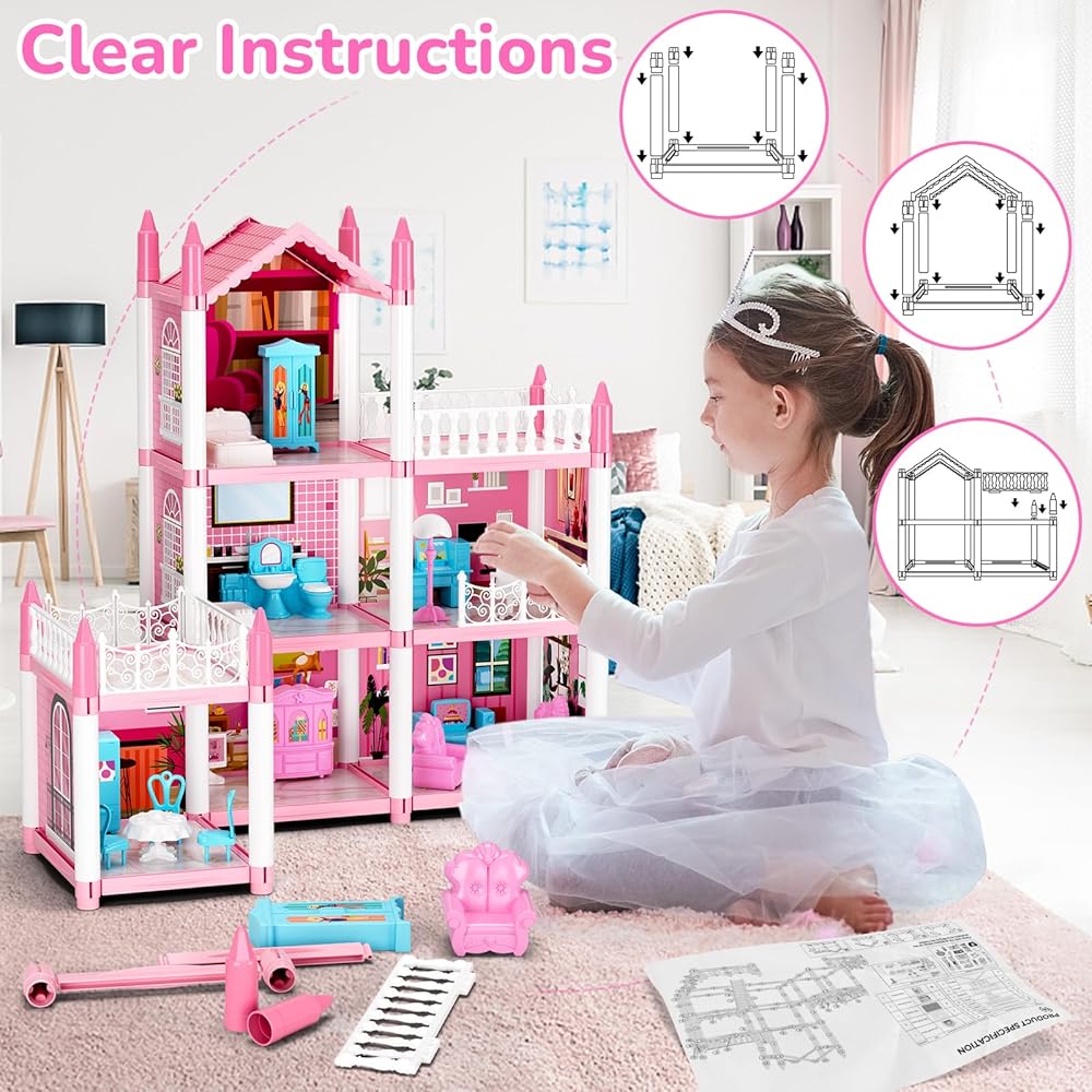 Doll House for Girls, DIY Dream Dollhouse with Furniture and Rooms Accessories, Miniature Pretend Playhouse with Lights, Building Princess House Dolls Playset Figures Toys Kit Gift for Ages 3+