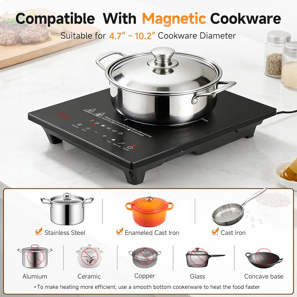 [PORTABLE INDUCTION BURNER] The induction cooktop is thoughtfully engineered to accommodate from 4.7" to 10.2" pans with magnetic bottoms and is optimized for use in 110 to 120V environments, meeting the standards of North American households. The sleek black ceramic glass panel not only exudes sophistication but also ensures durability and effortless cleaning. Measuring 13.8"*11.0"*2.6", this induction cooker is lightweight and only 4.8 pounds, making it the perfect addition to your kitchen.
