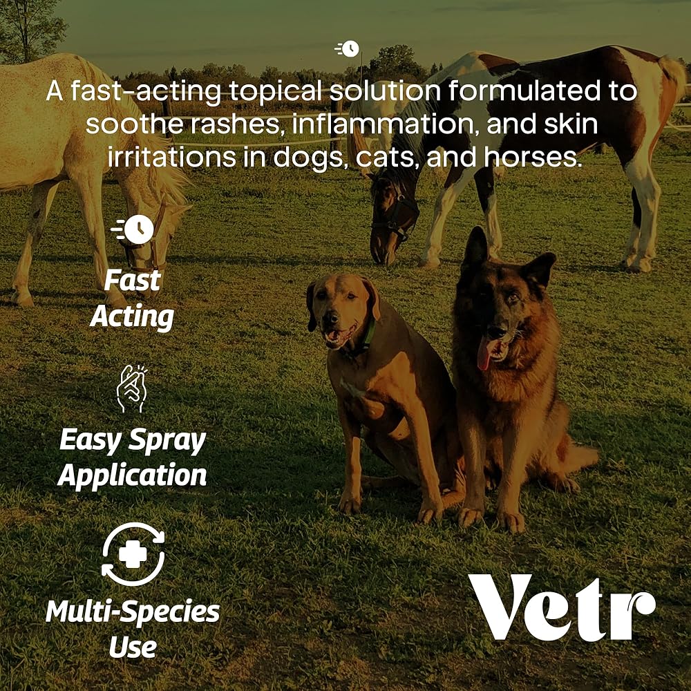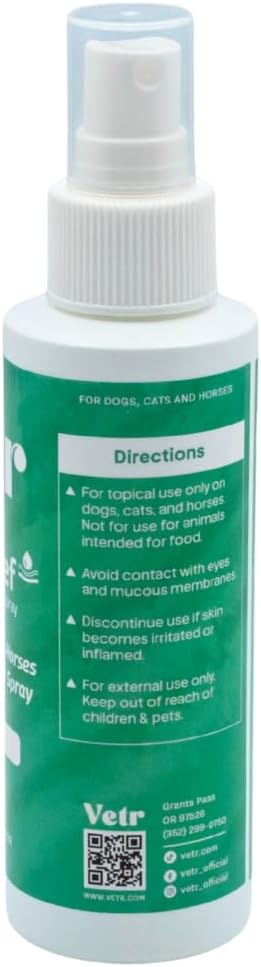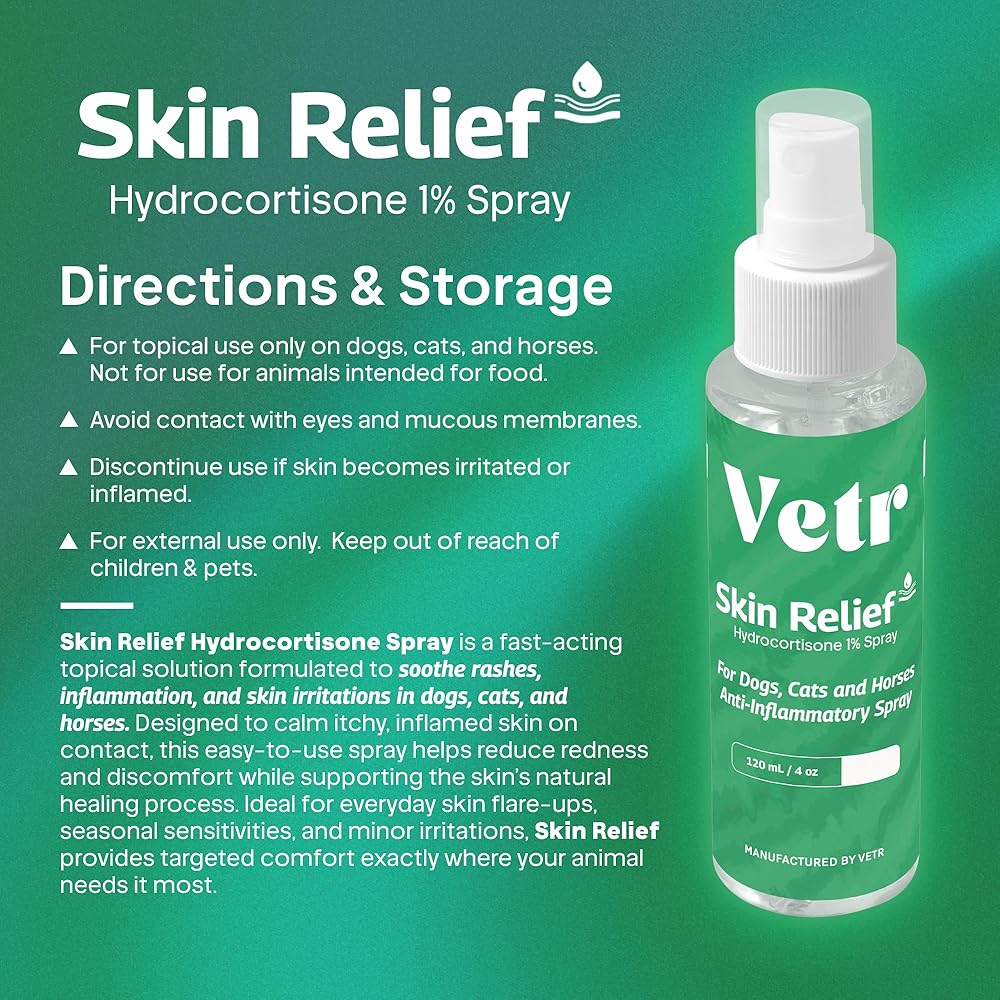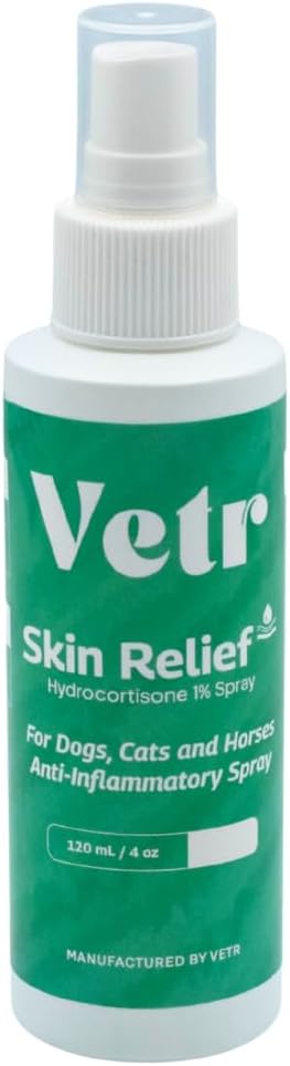 Vetr Skin Relief is a topical spray formulated with 1% hydrocortisone to support your dog's skin comfort during occasional irritations. This 4 oz (120mL) bottle is suitable for dogs of all breeds and sizes, offering a convenient way to apply to areas like hot spots or bite sites.