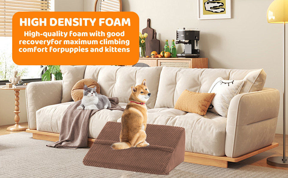 Update 40D Stairs Suitable for All Small Dogs & Cats: Our small dog ramp use 40D high density foam that is not easily deformed for all sized cats and small dogs. The cover is removable and machine washable. It's suitable for puppies, short-legged dogs(such as dachshund, corgi, pug, bulldog) and cats to get on staircase easily when they need to get up or downstairs