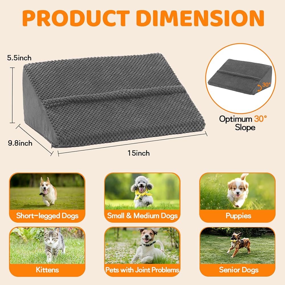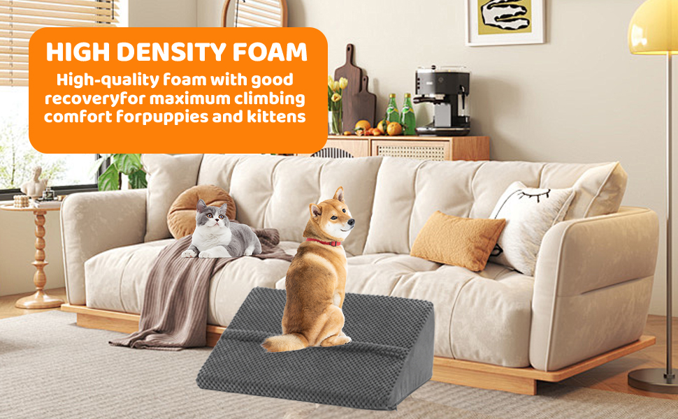 Update 40D Stairs Suitable for All Small Dogs & Cats: Our small dog ramp use 40D high density foam that is not easily deformed for all sized cats and small dogs. The cover is removable and machine washable. It's suitable for puppies, short-legged dogs(such as dachshund, corgi, pug, bulldog) and cats to get on staircase easily when they need to get up or downstairs